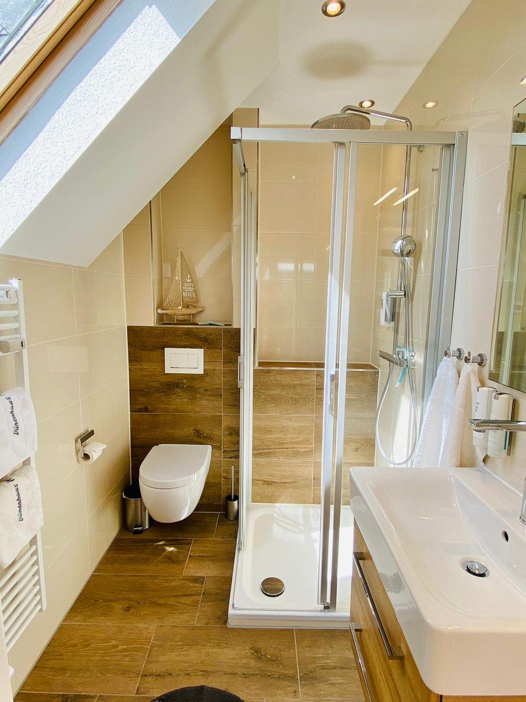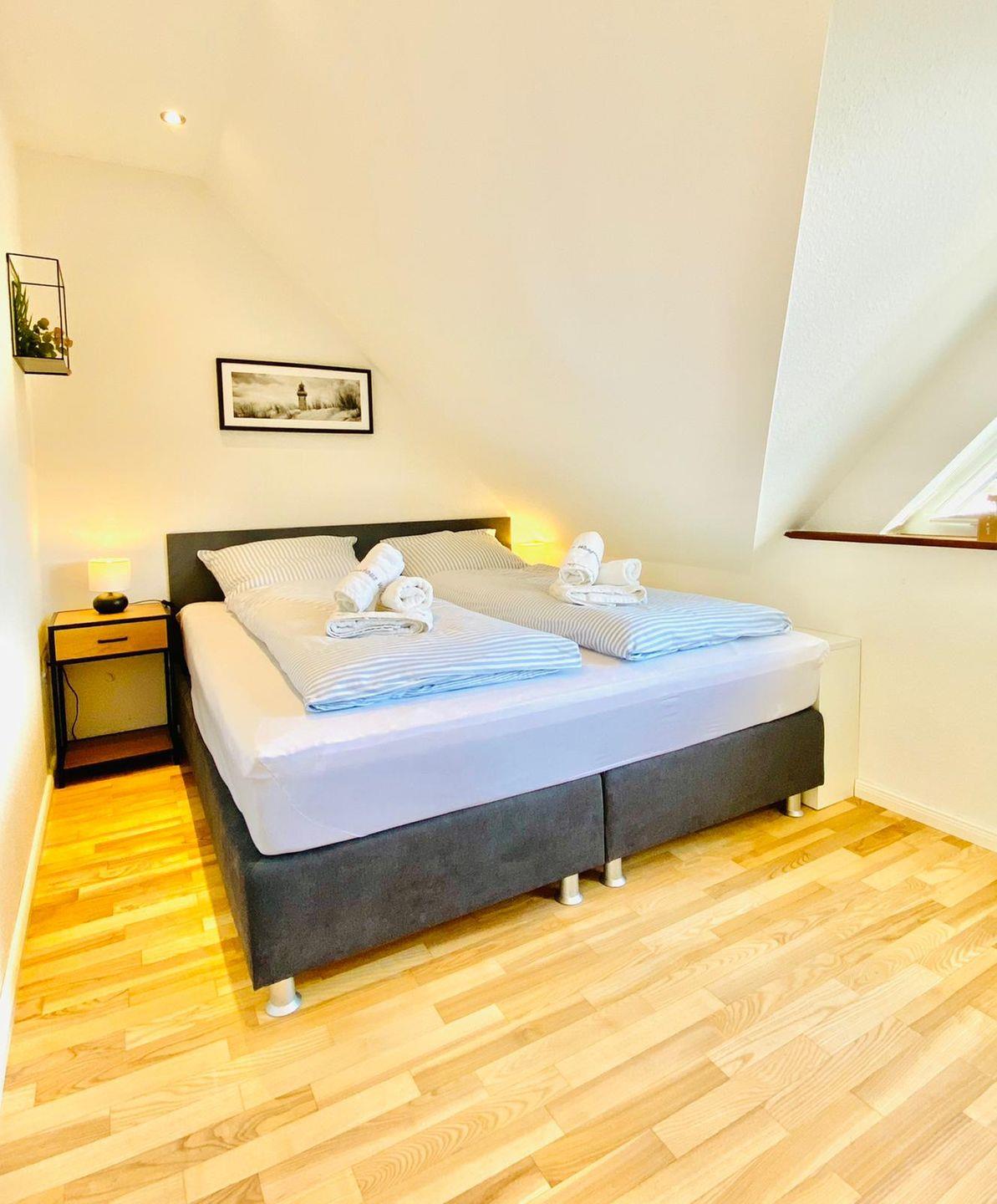 Die Wohnung verfügt über ein komfortables Schlafzimmer mit einem Vinylboden, ideal für Allergiker geeignet. Zudem finden Sie hier eine Garderobe sowie ausreichend Stauraum in einer Kommode. Das moderne Bad ist mit Seife, Shampoo & Duschgel und Handtüchern ausgestattet und bietet Ihnen alles, was Sie für Ihren Aufenthalt benötigen.