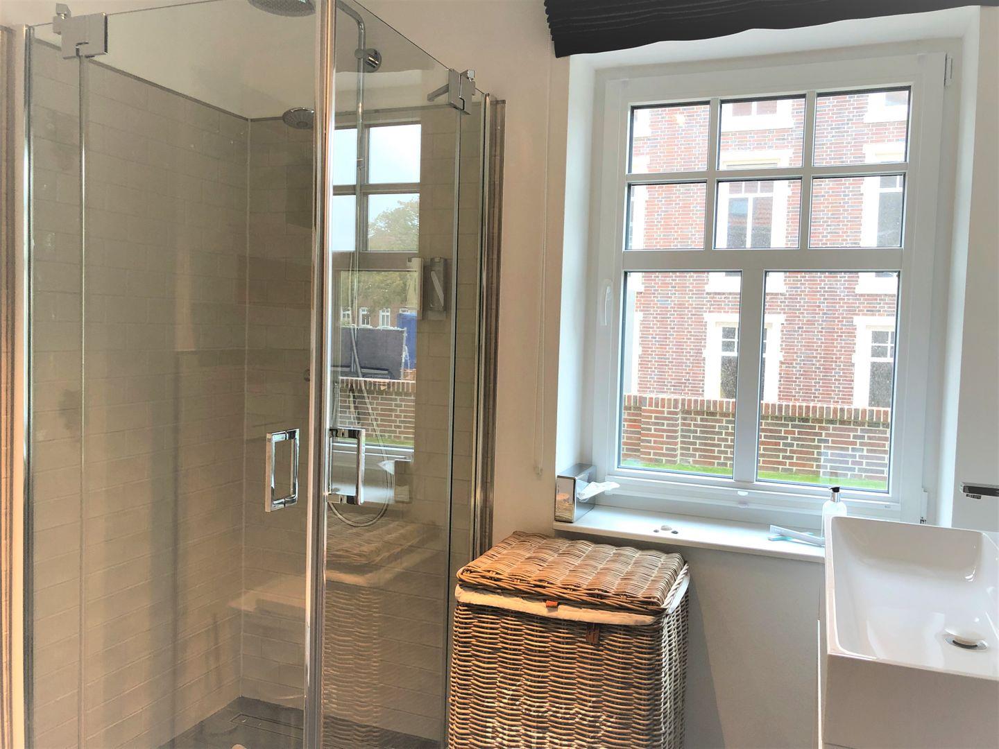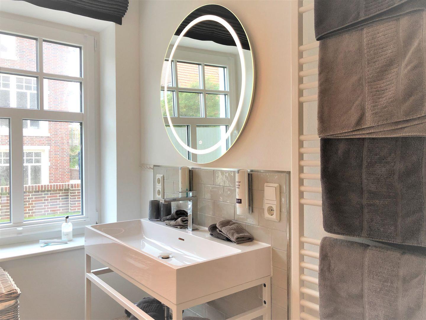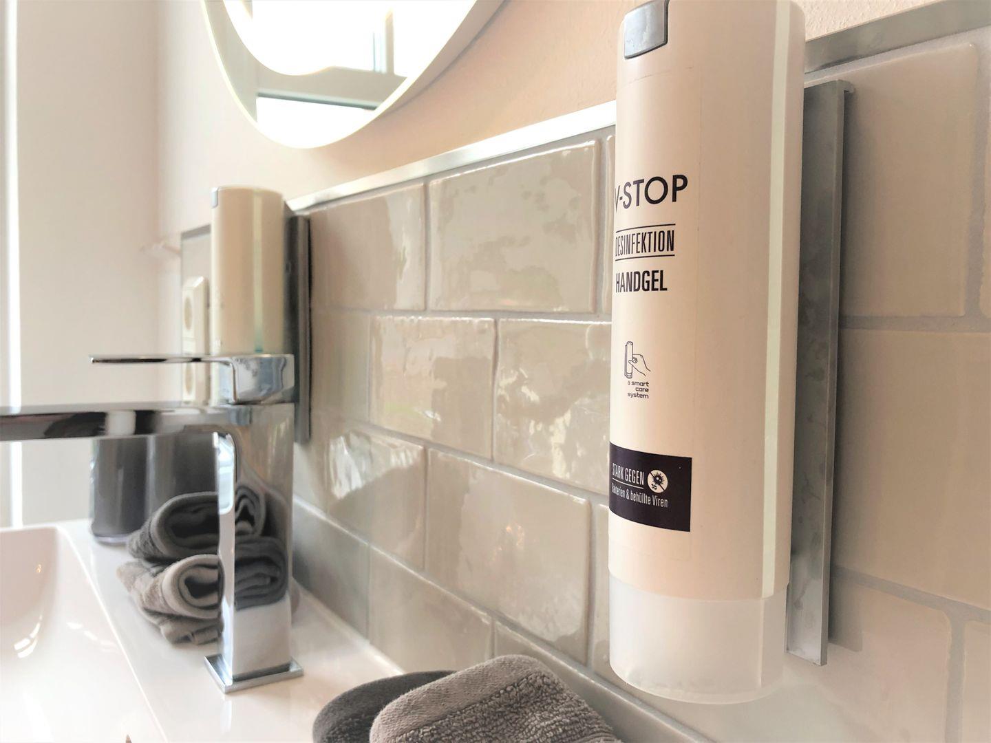 Das modern hergerichtete Tageslicht-Badezimmer verfügt über eine bodengleiche Duschkabine, WC und einen Handtuchwärmer. Selbstverständlich liegen Handtücher für Sie bereit und für die nötigen Utensilien wie Flüssigseife, Body- & Hairshampoo und Kosmetiktücher ist gesorgt.