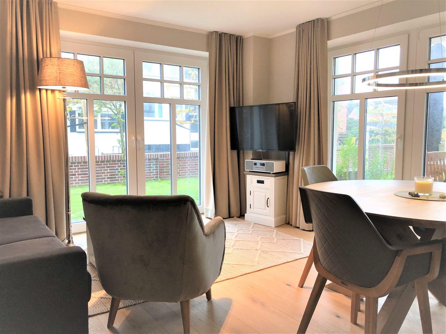 Treten Sie ein und freuen Sie sich auf Komfort in warmen mediterranen Farben und hochwertiger, geschmackvoller Dekoration. Ihr Wohn- und Essbereich ist liebevoll gestaltet und durch bodentiefe Fenster lichtdurchflutet. Eine gemütliche Couchecke mit Sessel lädt zum Träumen und Verweilen ein. Hier stehen Ihnen Flat-TV und WLAN zur Verfügung.