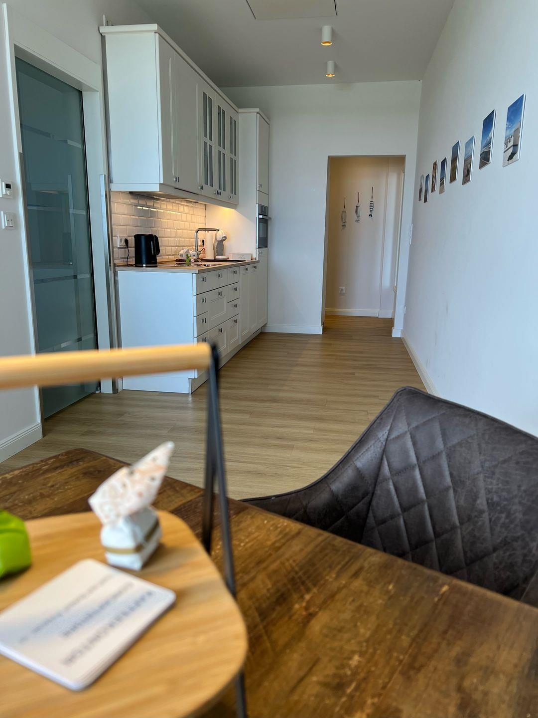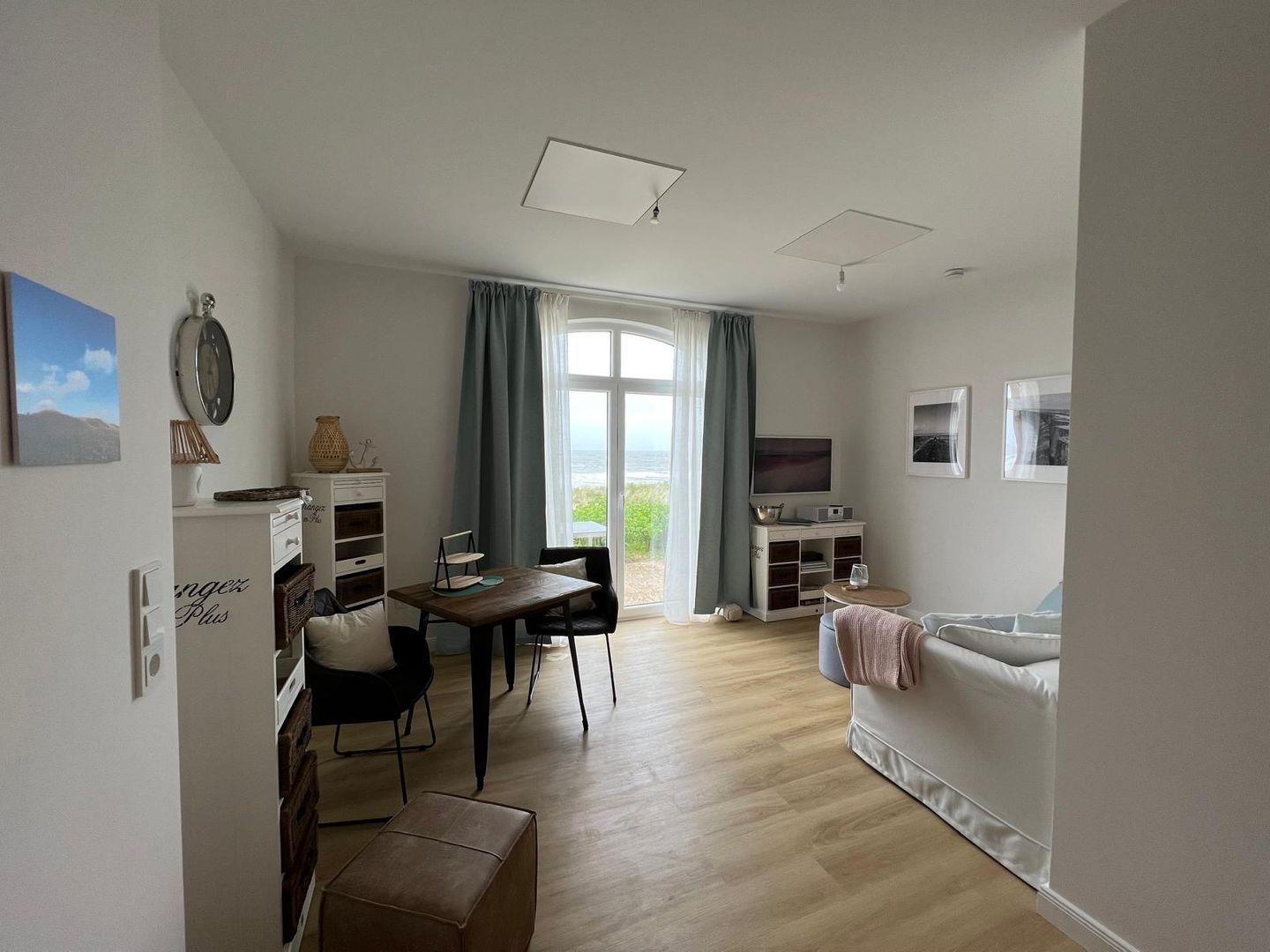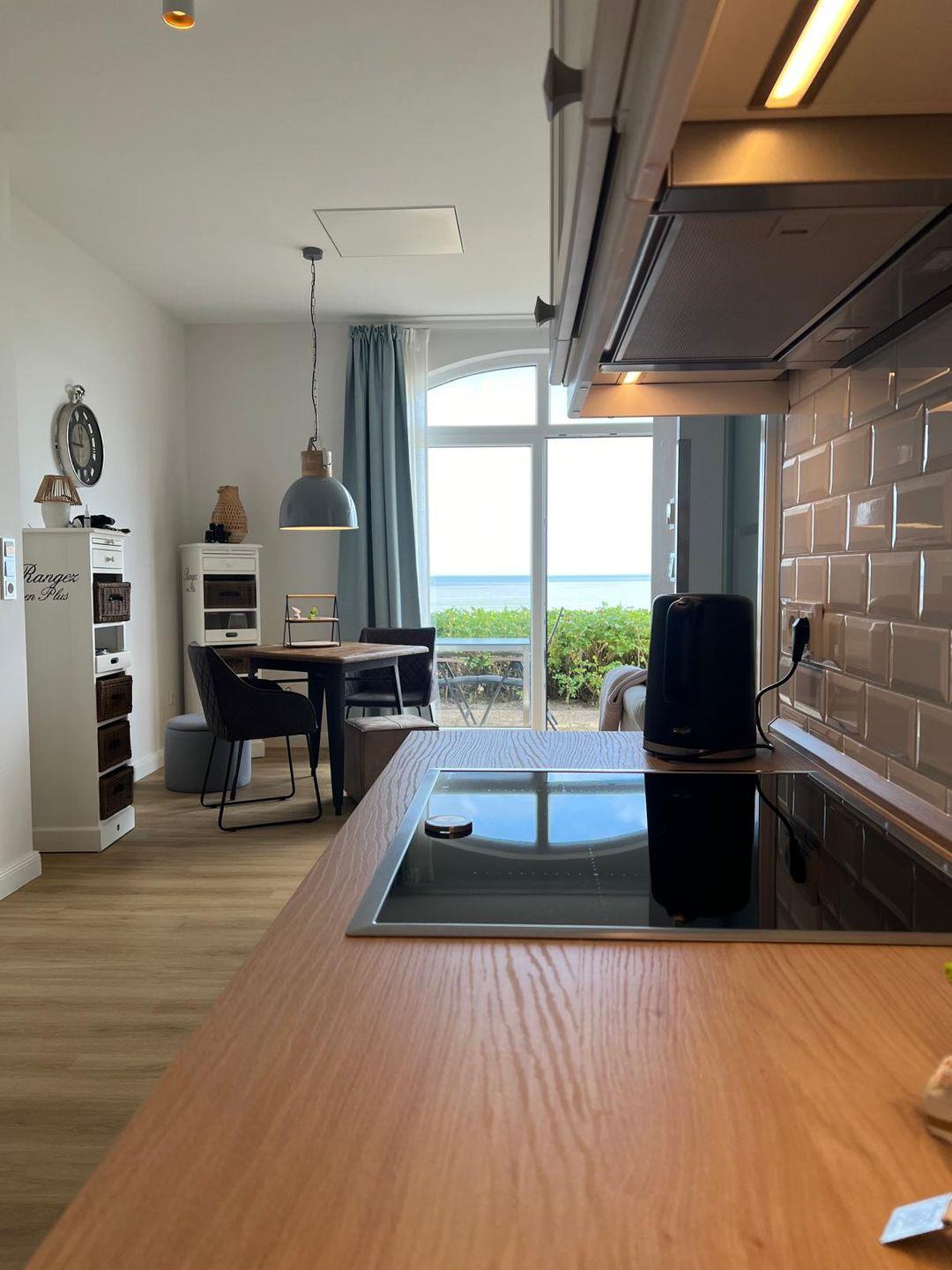Neben dem direkten Blick auf das Meer und der wunderbaren Lage in erster Reihe zum Strand, glänzt die im Jahr 2022 neu sanierte Wohnung 8 auch mit einer vollständig ausgestatteten Küche, einem Duschbad, dem Wohnzimmer mit Couch, einem Schlafzimmer und der Terrasse mit Ausrichtung zum Wasser, auf welcher entspannt gespeist werden kann.
