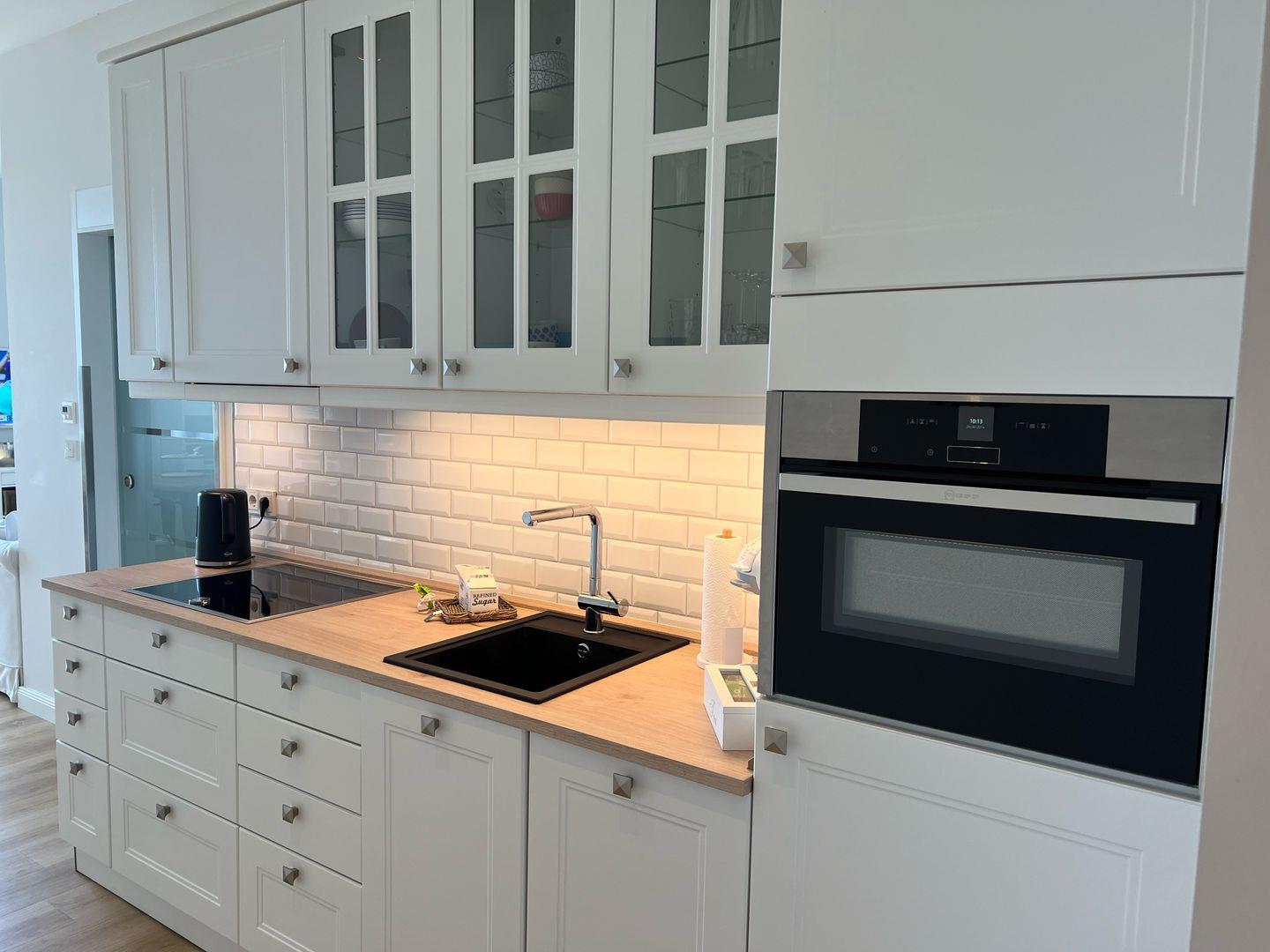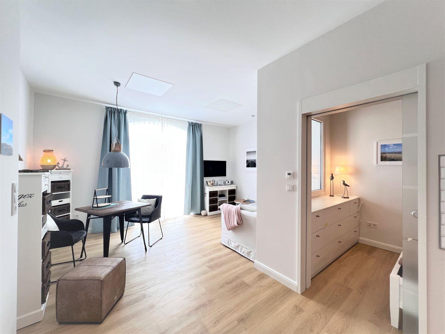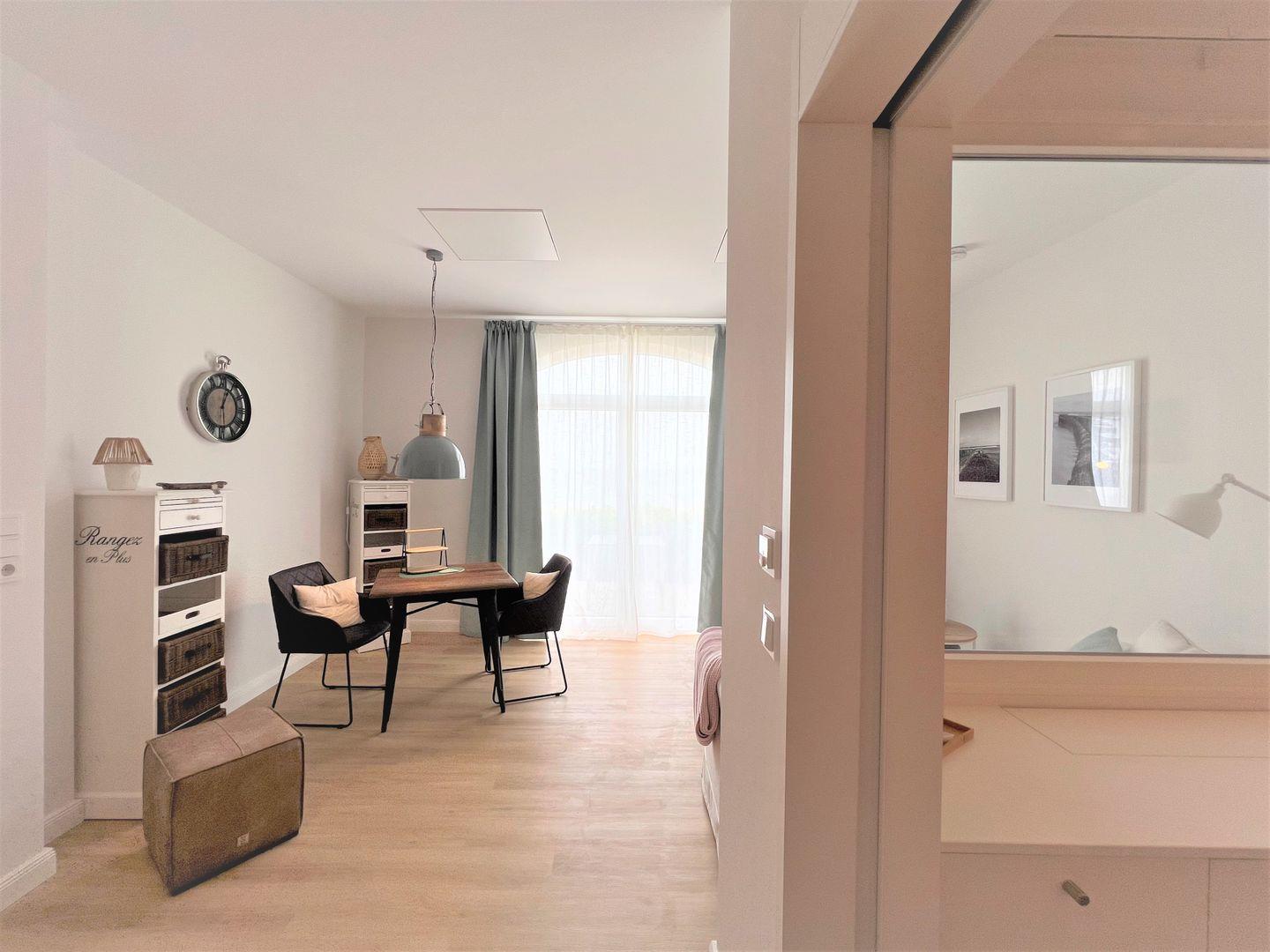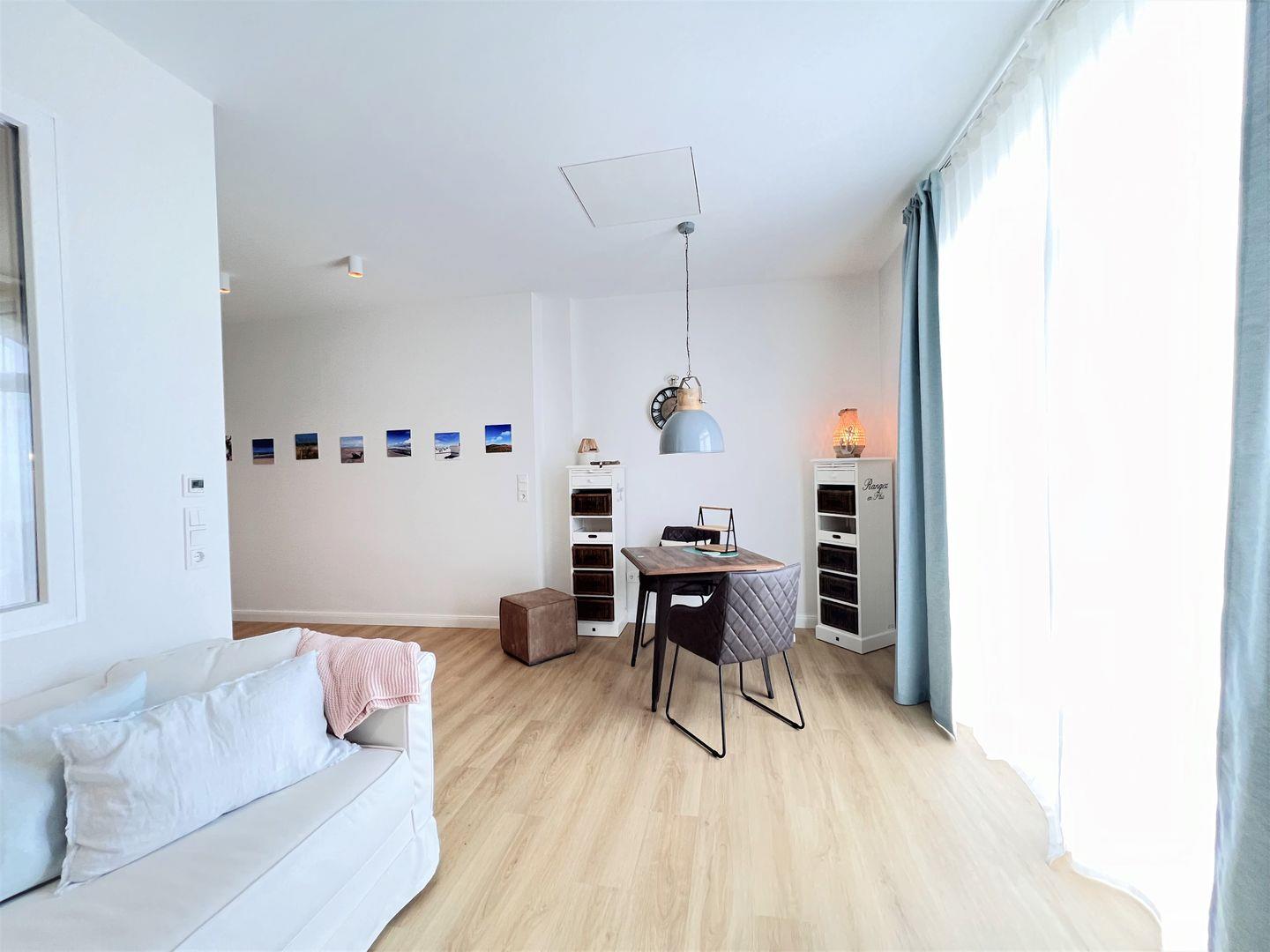 Neben dem direkten Blick auf das Meer und der wunderbaren Lage in erster Reihe zum Strand, glänzt die im Jahr 2022 neu sanierte Wohnung 8 auch mit einer vollständig ausgestatteten Küche, einem Duschbad, dem Wohnzimmer mit Couch, einem Schlafzimmer und der Terrasse mit Ausrichtung zum Wasser, auf welcher entspannt gespeist werden kann.