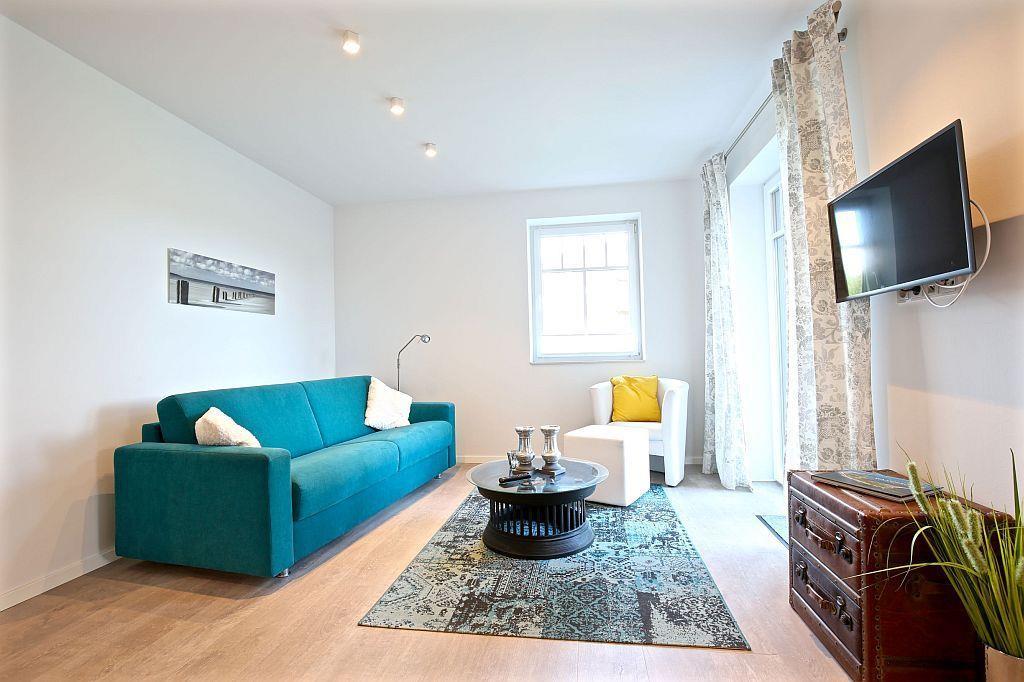 Eine weitere dritte Person kann auf Anfrage im Wohnzimmer das hochwertige Schlafsofa beziehen.