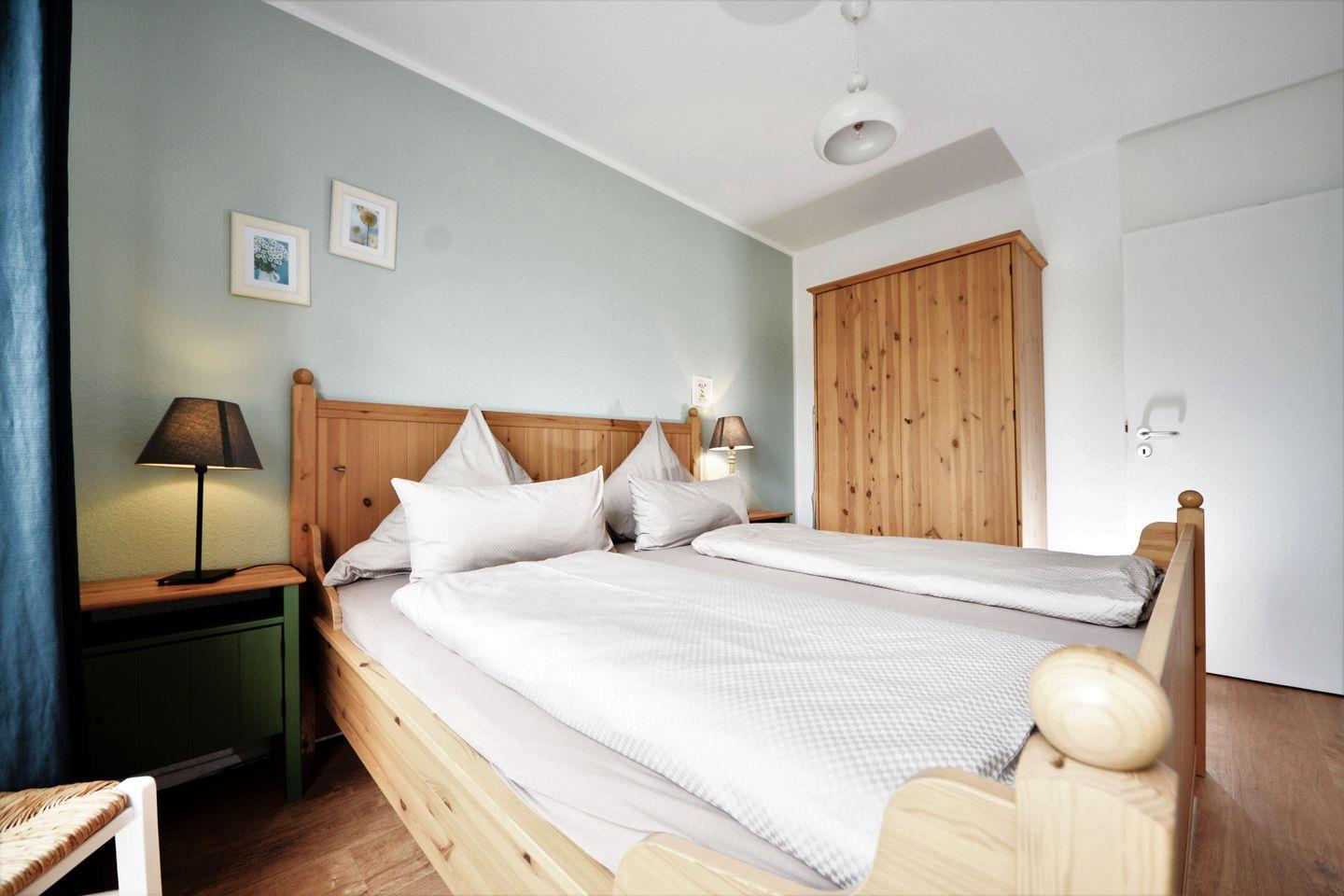 Auch das Schlafzimmer 3 hat einen Zugang zum Balkon. Hier steht ein komfortables Etagenbett, ideal für Kinder und Jugendliche. Im 4. Schlafzimmer mit Dachschräge stehen zwei weitere gemütliche Einzelbetten. Alle Betten werden vor Ihrer Ankunft mit hochwertiger Bio-Baumwollbettwäsche bezogen.