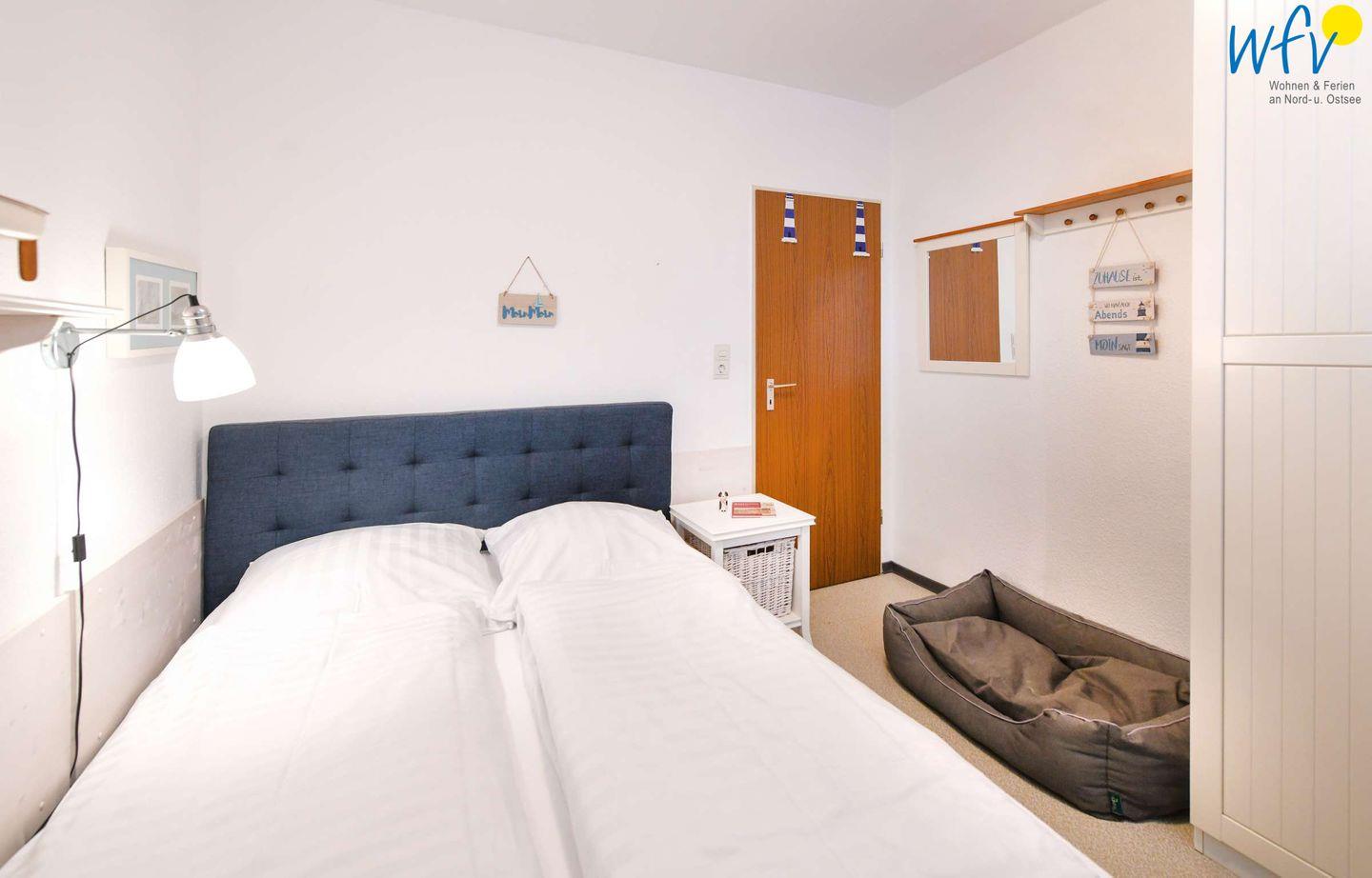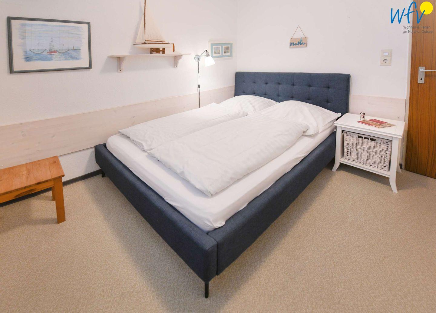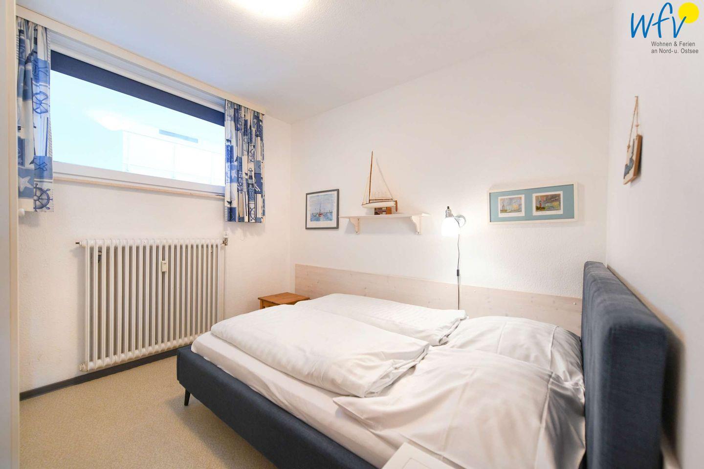 Wenn auf Wangerooge die Sonne untergeht, können Sie es sich in dem separaten Schlafzimmer mit Doppelbett gemütlich machen. Eine dritte Person findet auf der Schlafcouch im Wohnzimmer Platz.