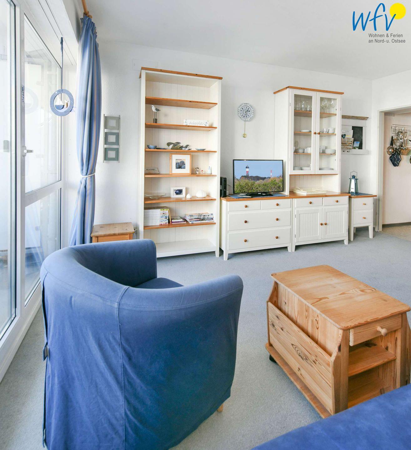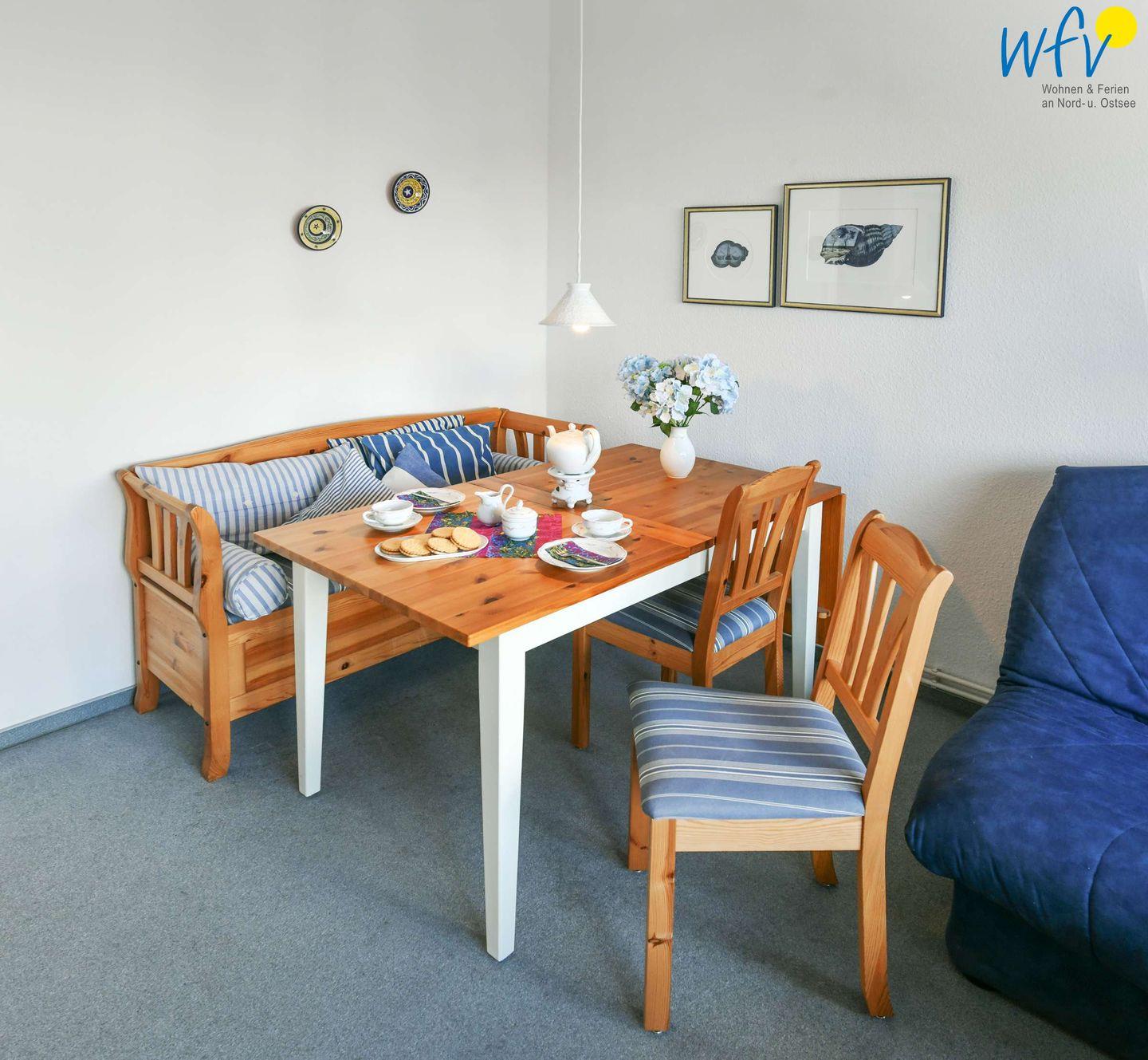 Der Wohnraum mit maritimer Einrichtung bietet Ihnen ein gemütliches Plätzchen am Abend oder an kühleren Tagen. Einen guten Film schauen, Musik hören, lesen oder einfach nur beisammen sitzen und erzählen - das ist Urlaub!