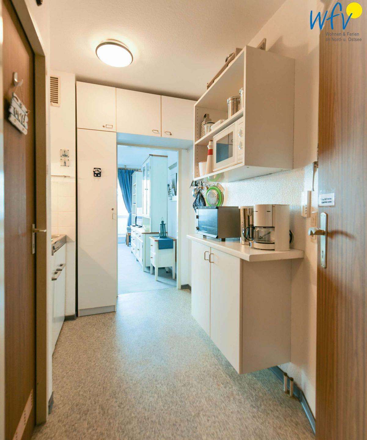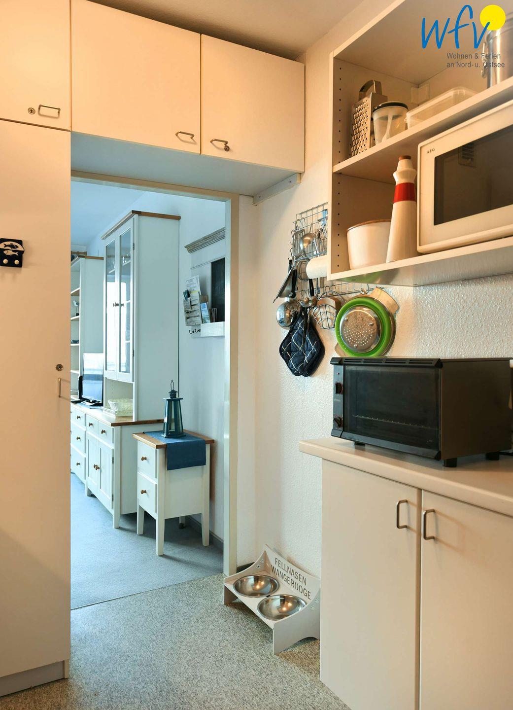 Für den Snack zwischendurch oder kleine Mahlzeiten verfügt die Ferienwohnung auf Wangerooge über eine Kochnische - u.a. mit Herd, Backofen, Mikrowelle und diversen Kleingeräten. Ein Esstisch mit bequemer Sitzbank gehört ebenfalls zur Einrichtung.