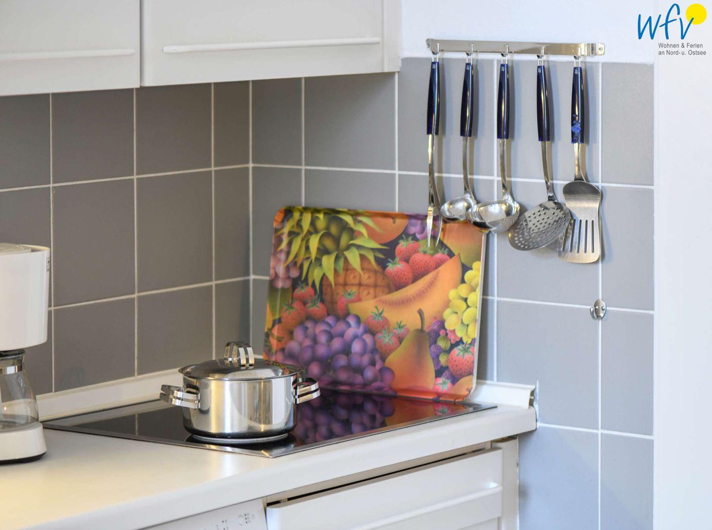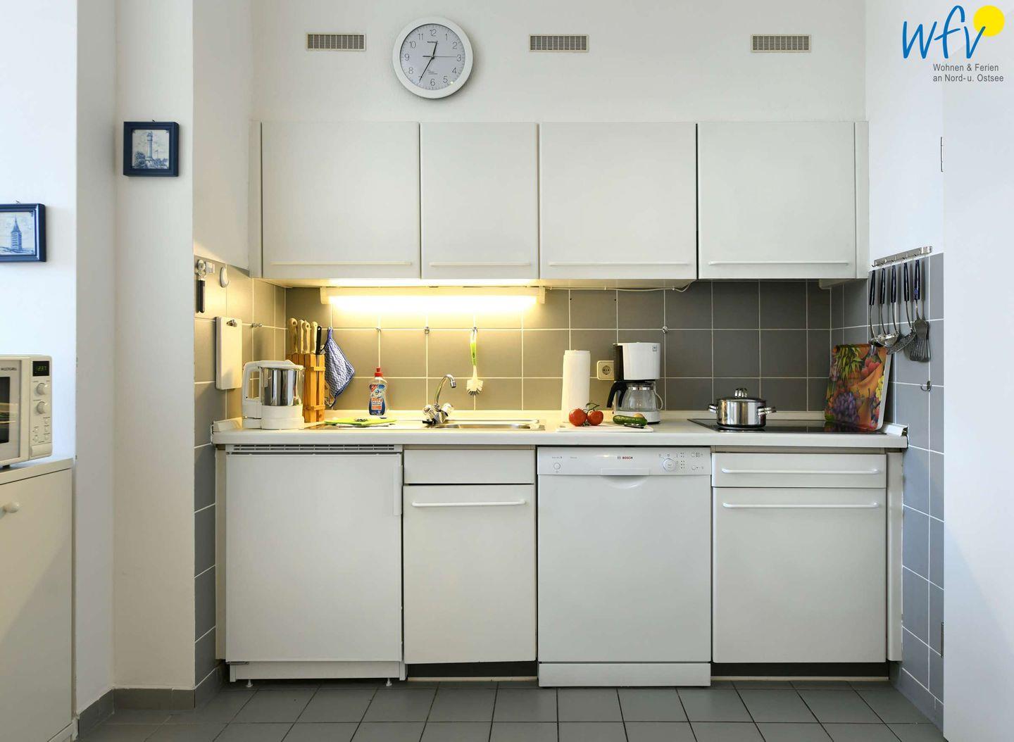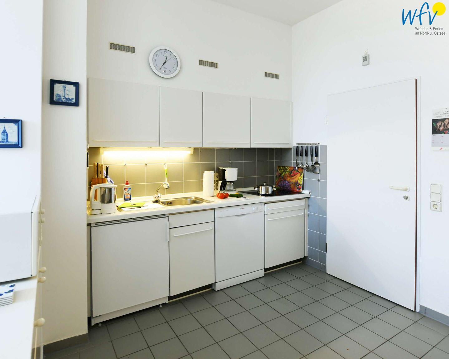 Ob nach dem Strandtag, der Fahrradtour oder der Wattwanderung - im Wohnbereich mit Couchecke und TV können Sie ausgiebig relaxen! Angrenzend befindet sich hier eine offene Küche - u.a. mit Herd, Mikrowelle und Spülmaschine - sowie ein Esstisch für gemeinsame Mahlzeiten. So können Sie sich in Ihrem Urlaub auf Wangerooge angenehm selbst verpflegen.