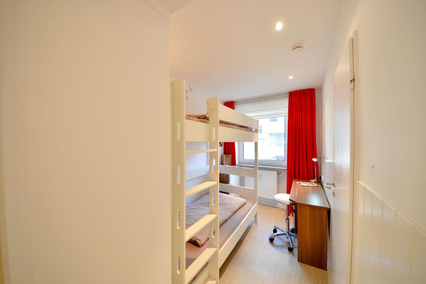Viele kleine Akzente verleihen auch Ihrem zweiten Schlafbereich das richtige Ambiente. Es bietet ein Etagenbett mit Leselampen und einem Schreibtisch, um die Gedanken aufs Papier zu bringen. Von hier aus gelangen Sie in das moderne Badezimmer mit fast ebenerdiger Dusche und allem was Sie benötigen.