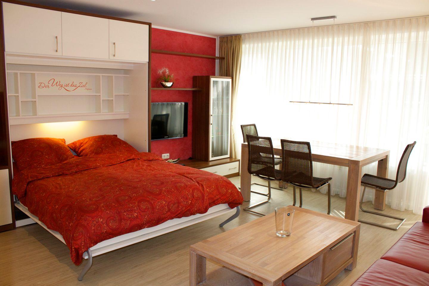 Das in den Wohnbereich integrierte Schlafzimmer mit hochwertigem Schrankbett bietet Platz für zwei Personen, auf separaten Matratzen (90/200cm), gemütlich zu schlafen und sich zu erholen.