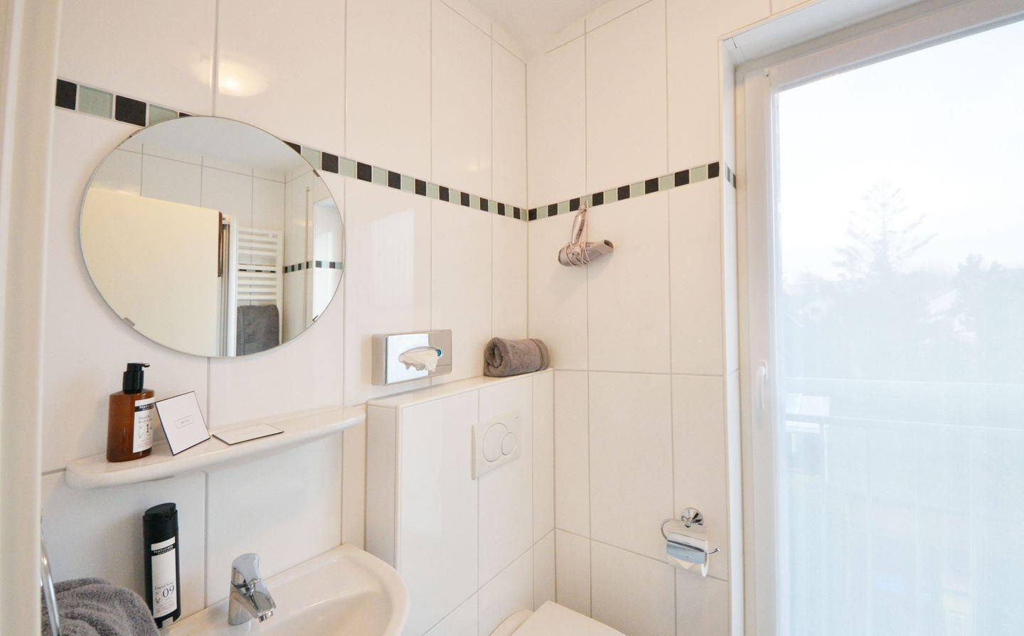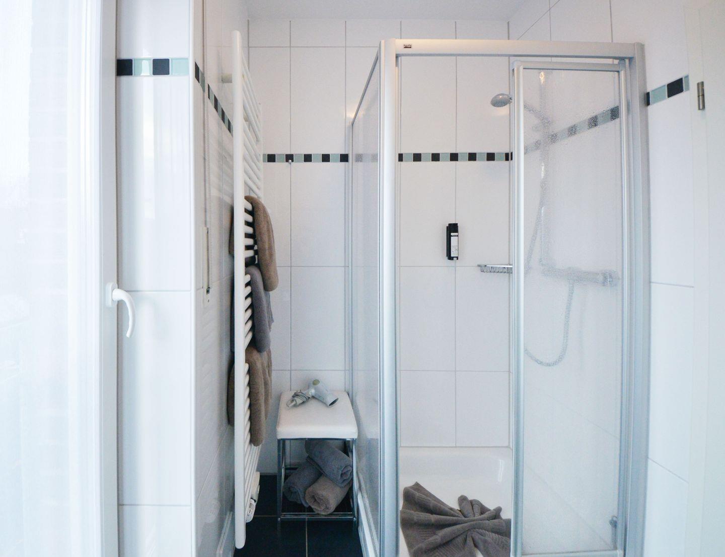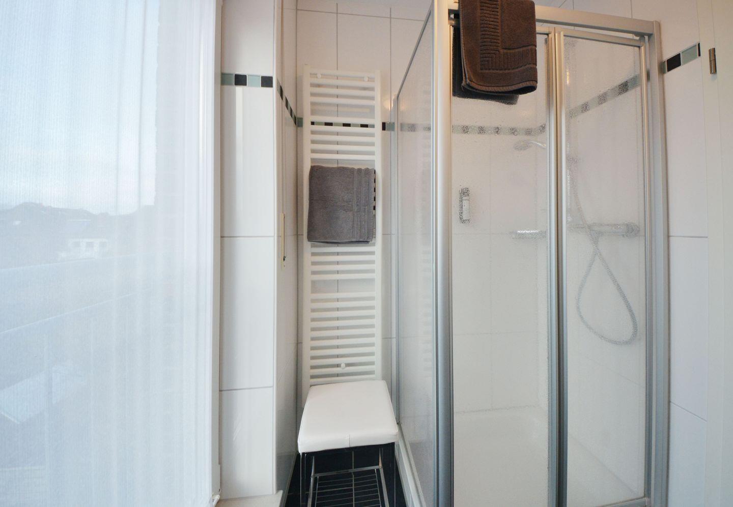Beide Duschbäder werden über bodentiefe Fenster belüftet und verfügen neben einem Fön auch über einen Kosmetikspiegel.