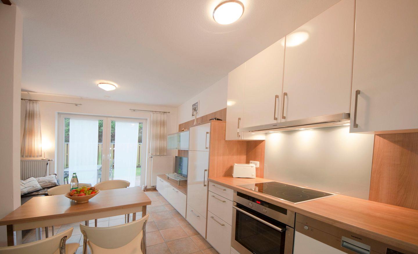 Durch die komplett eingerichtete Küche fällt es nicht schwer sich selbst zu versorgen. Gemeinsam können Sie nach dem Zubereiten alles am Esstisch drinnen oder bei schönem Wetter auch am großen Tisch auf der nach Süden ausgerichteten Terrasse genießen.