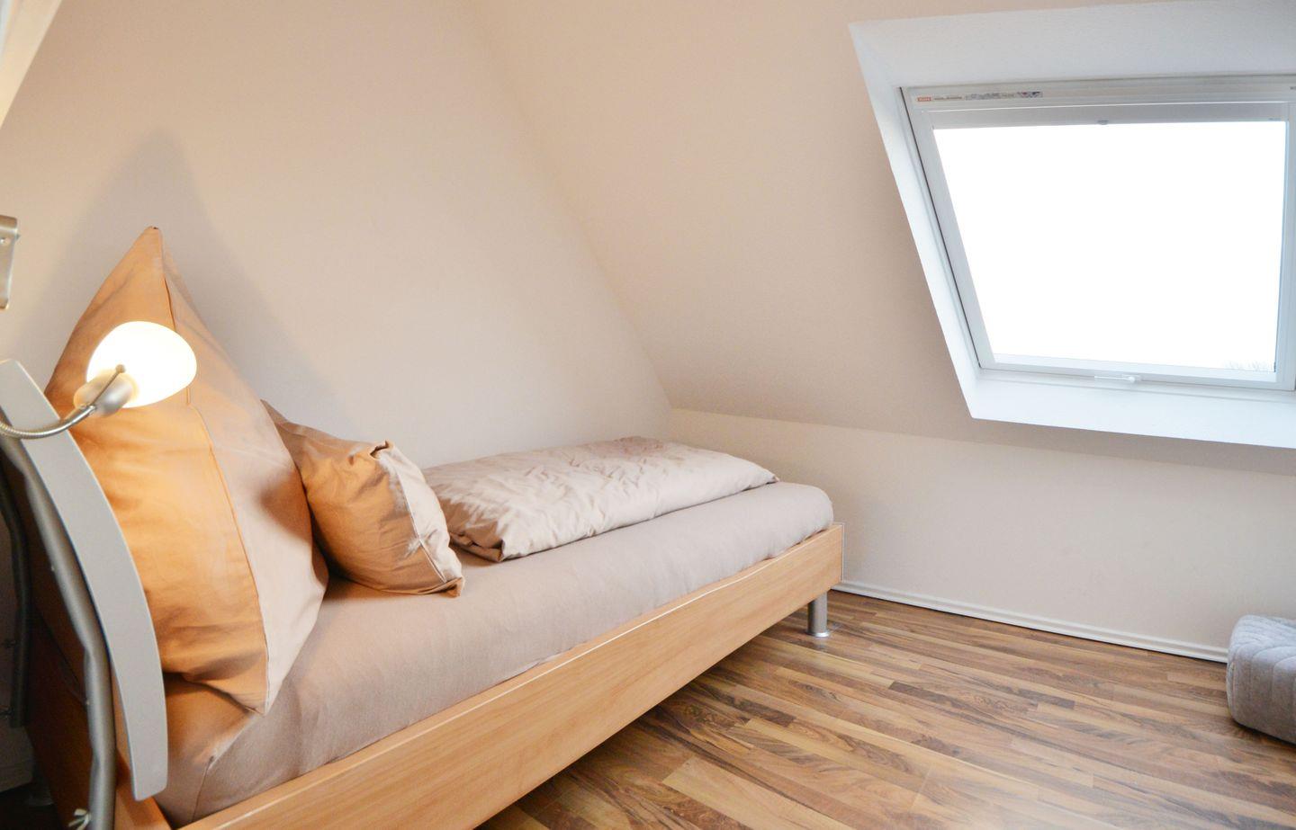 Im kleineren Schlafzimmer im Dachgeschoss steht ein Einzelbett (80 x 200).