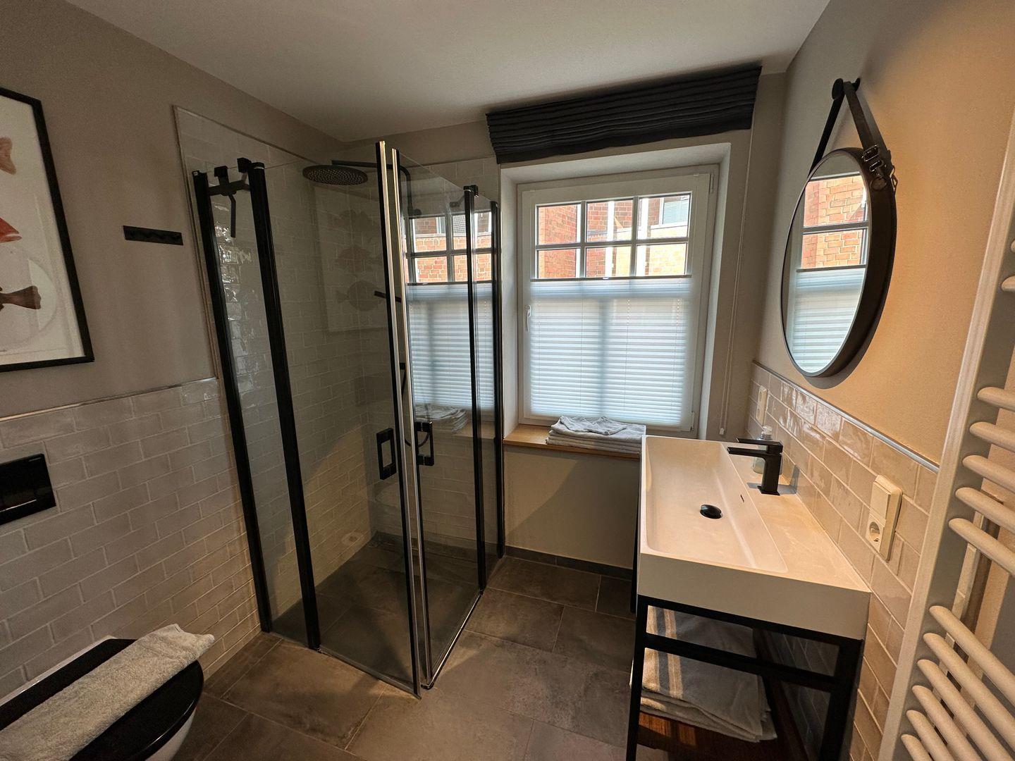 Das Badezimmer mit der großzügigen Dusche glänzt mit Ihrem Design. Ein kleiner Abstellraum ist auch vorhanden.