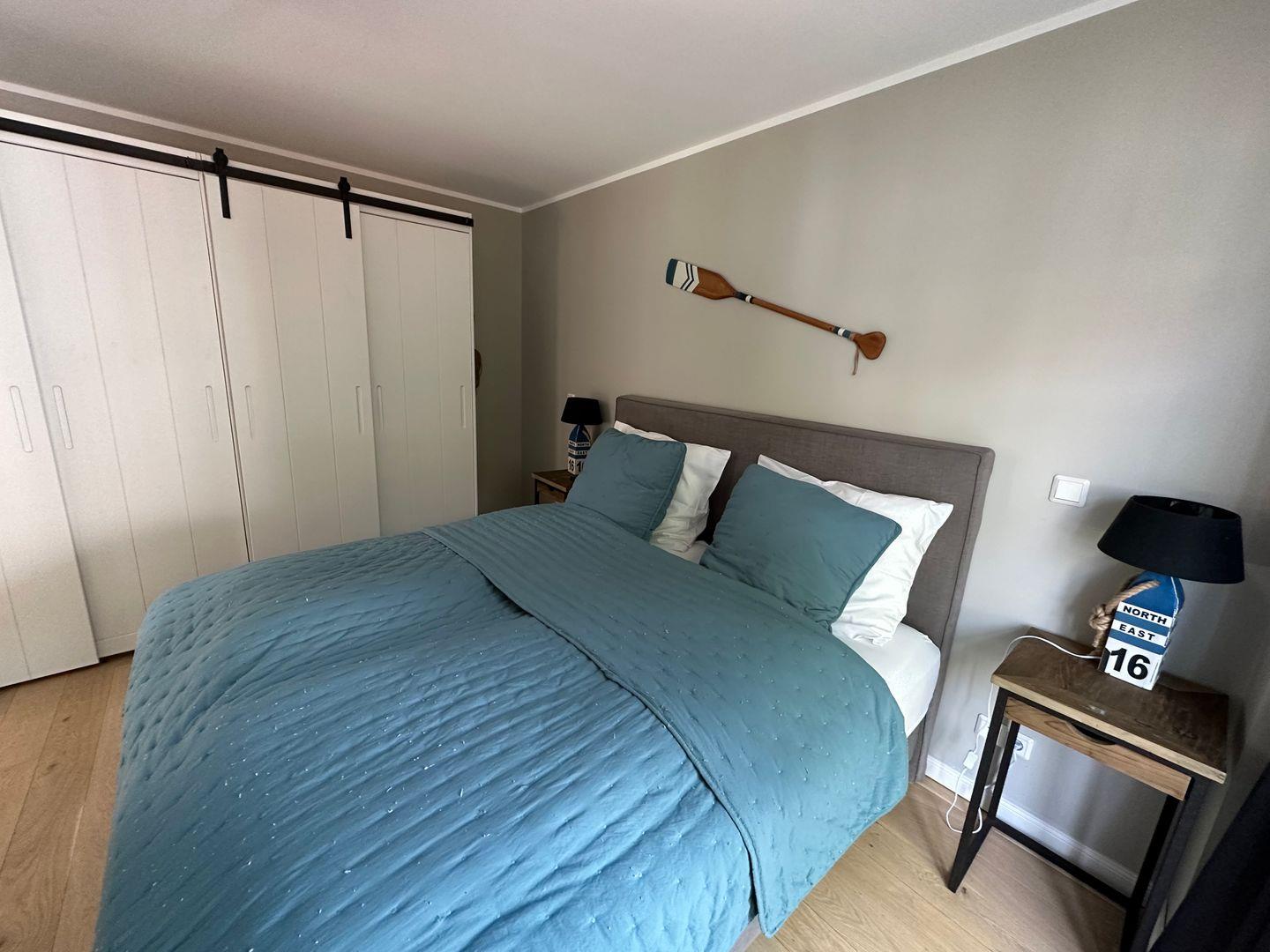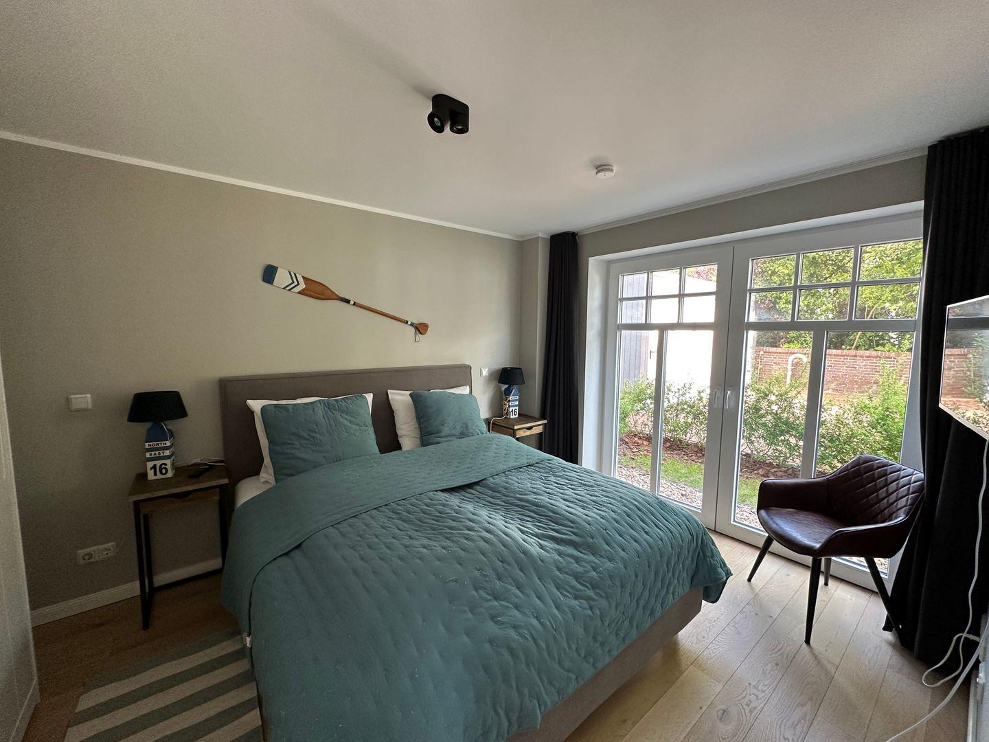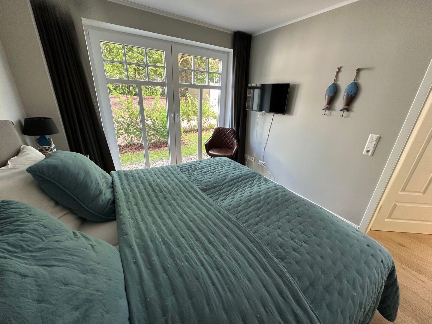 Das Schlafzimmer ist mit einem hochwertigen Boxspringbett ausgestattet inkl. Smart TV und geräumigem Kleiderschrank.