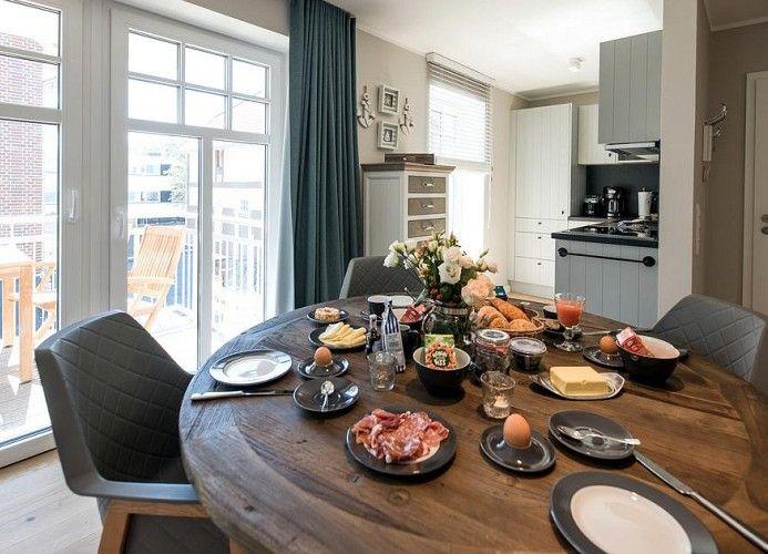 Die Ferienwohnung Silbermöwe auf Wangerooge bietet moderne Landhausküche, gemütliche Terrasse und hochwertige Ausstattung für erholsame Tage.