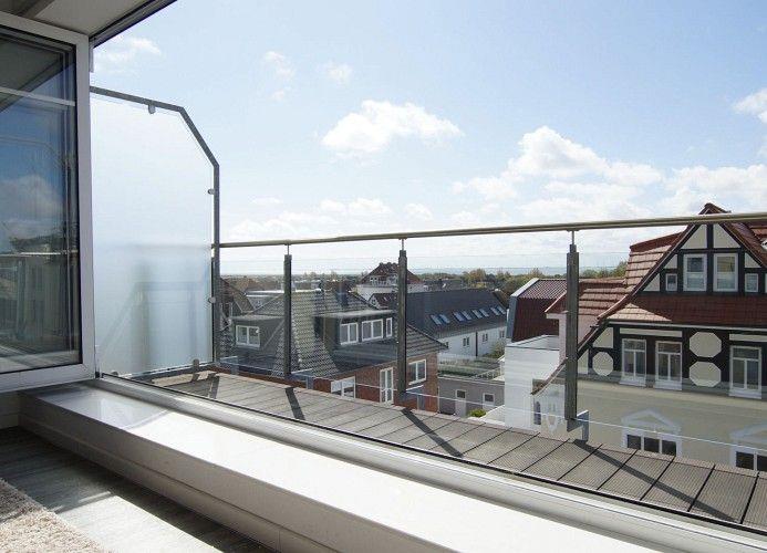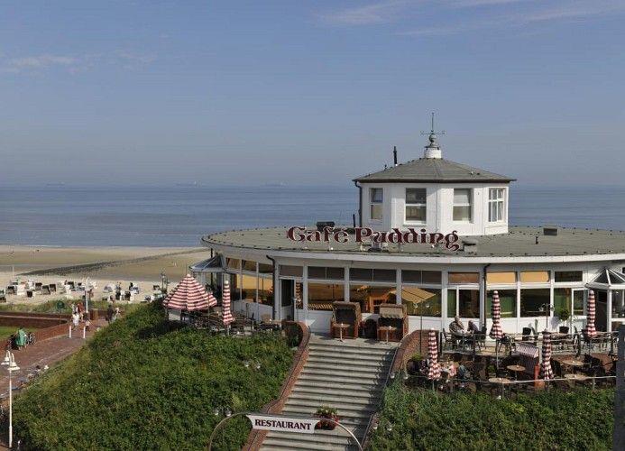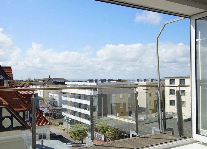 Wangerooge, die Zedeliusstraße, das Wattenmeer und die Nordsee. Vom Westbalkon blickt man über das Cafe Pudding auf das offene Meer und die vorbeiziehenden