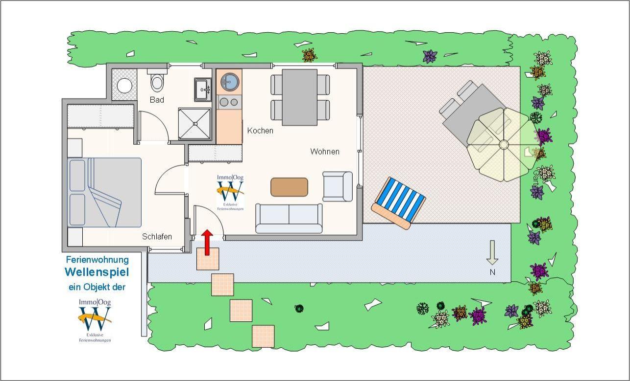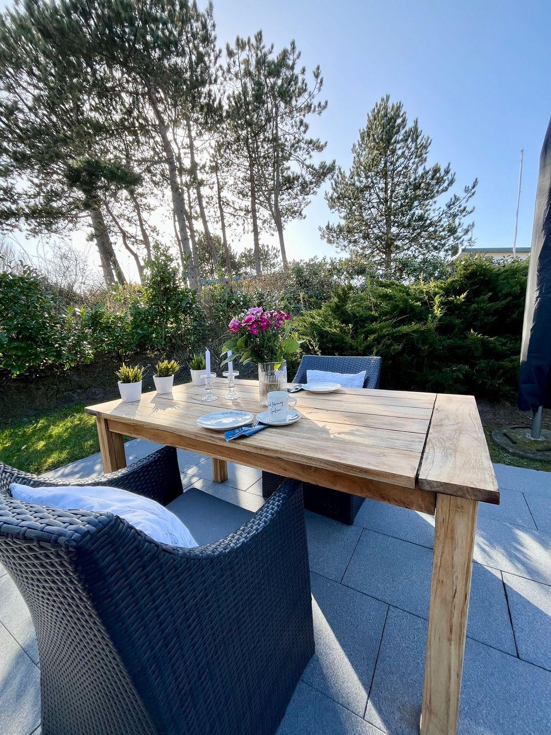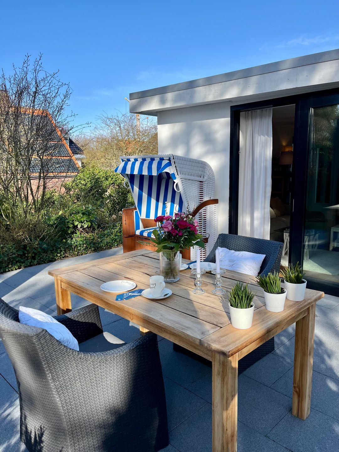 Genießen Sie entspannte Tage im charmanten Wellenspiel auf Wangerooge mit großer Terrasse und Strandnähe.