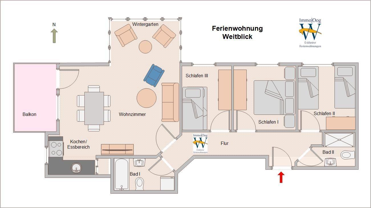 Die lichtdurchflutete und hochwertig ausgestattete Ferienwohnung besticht durch Ihre ideale Lage mit eigenen Balkon - Weitblick bis zum Leuchtturm im Westen. Optimal für eine Familie bis 6 Personen durch 3 Schlafzimmer. Die Wohnung verfügt über 2 Bäder inkl. Waschmaschine. Sie befindet sich im Hochparterre und lädt dank Wintergarten und Sessel zum Wohlfühlen unabhängig der Jahreszeit ein. Der großzügige Wohn-/ Essbereich und die moderne Einbauküche bieten Ihnen Sonne bis in den Abend hinein.