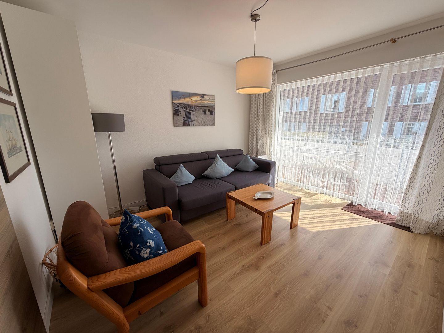 ebenfalls nach Süden ausgerichtete Wohnzimmer mit gemütlichem Doppel-Schlafsofa