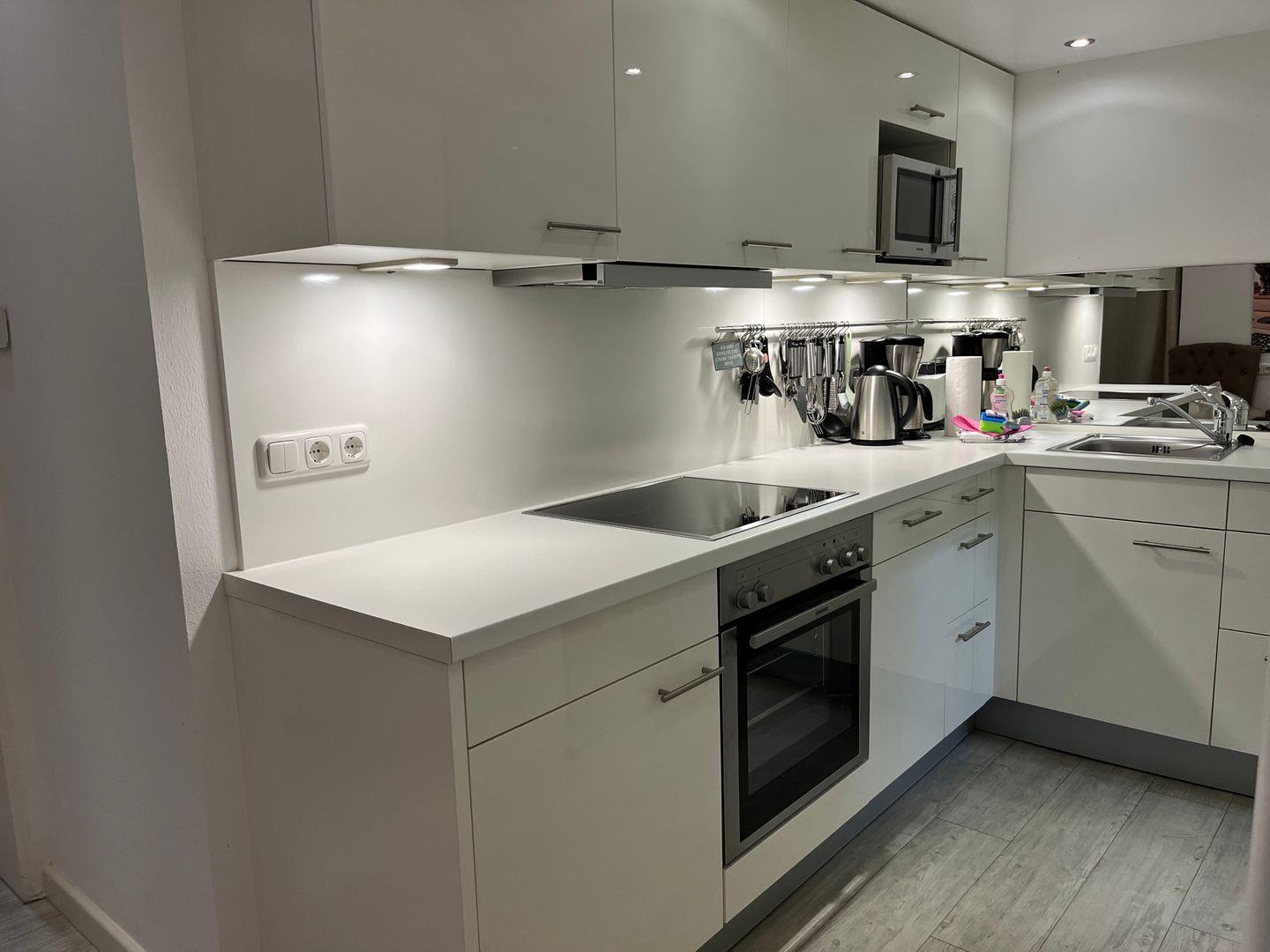 Wohnbereich ab. Eine Hochglanz-Küche mit gemütlichem Sitzbereich. 2