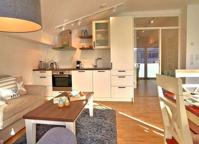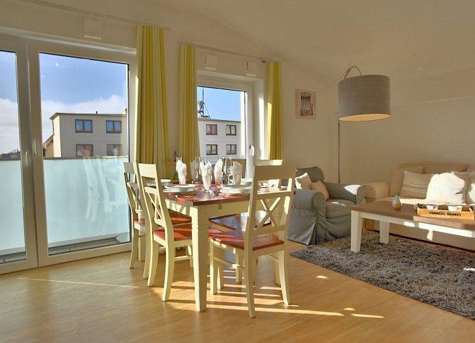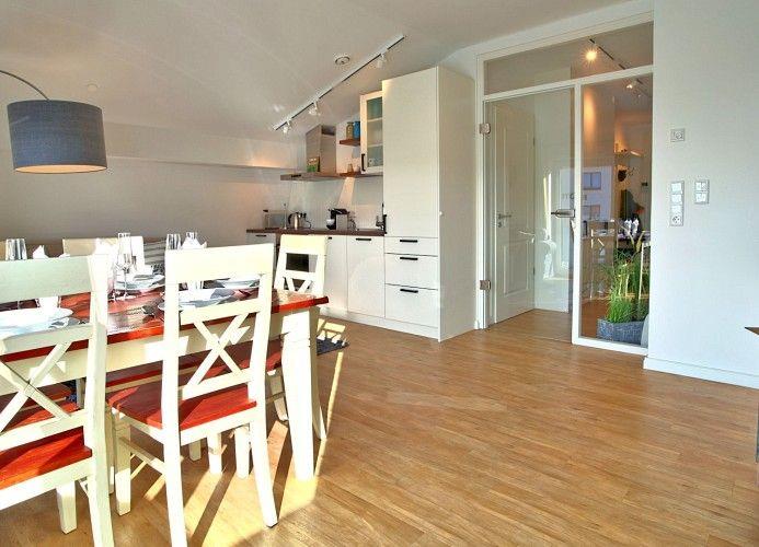 wertiger, geschmackvoller Dekoration auf der Urlaubsinsel Wangerooge. Ihr Wohn- und Essbereich ist äußerst liebevoll gestaltet und durch bodentiefe Fenster