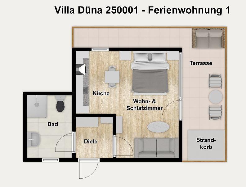 Auf 28 m² Wohnfläche ist das 1-Raum-Appartement optimal aufgeteilt. Perfekt für eine erholsame Auszeit zu zweit (ggf. mit Kleinkind). Bodentiefe Fenster mit zwei direkten Zugängen zur Süd-Ost-Terrasse und Nord-West-Terrasse durchfluten die Wohnung großzügig mit Sonne und Tageslicht. Auf den Terrassen wartet auf Sie ein bequemes Lounge Set sowie ein Esstisch mit Stühlen, eine Kippliege und ein Strandkorb.