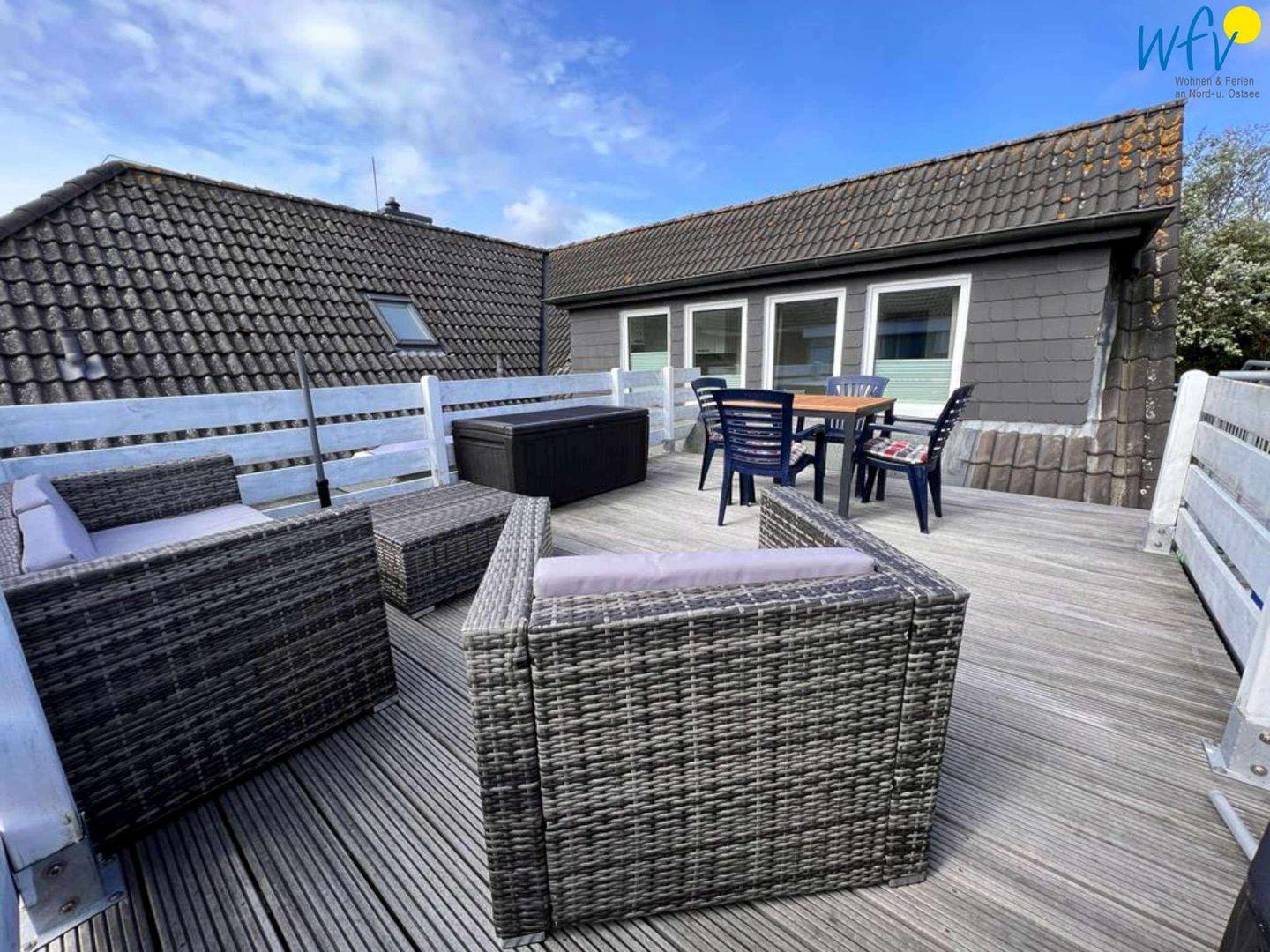 Gemütliche Ferienwohnung mit großer Dachterrasse und Blick auf Dünen und Leuchtturm, ideal für Familien auf Wangerooge.