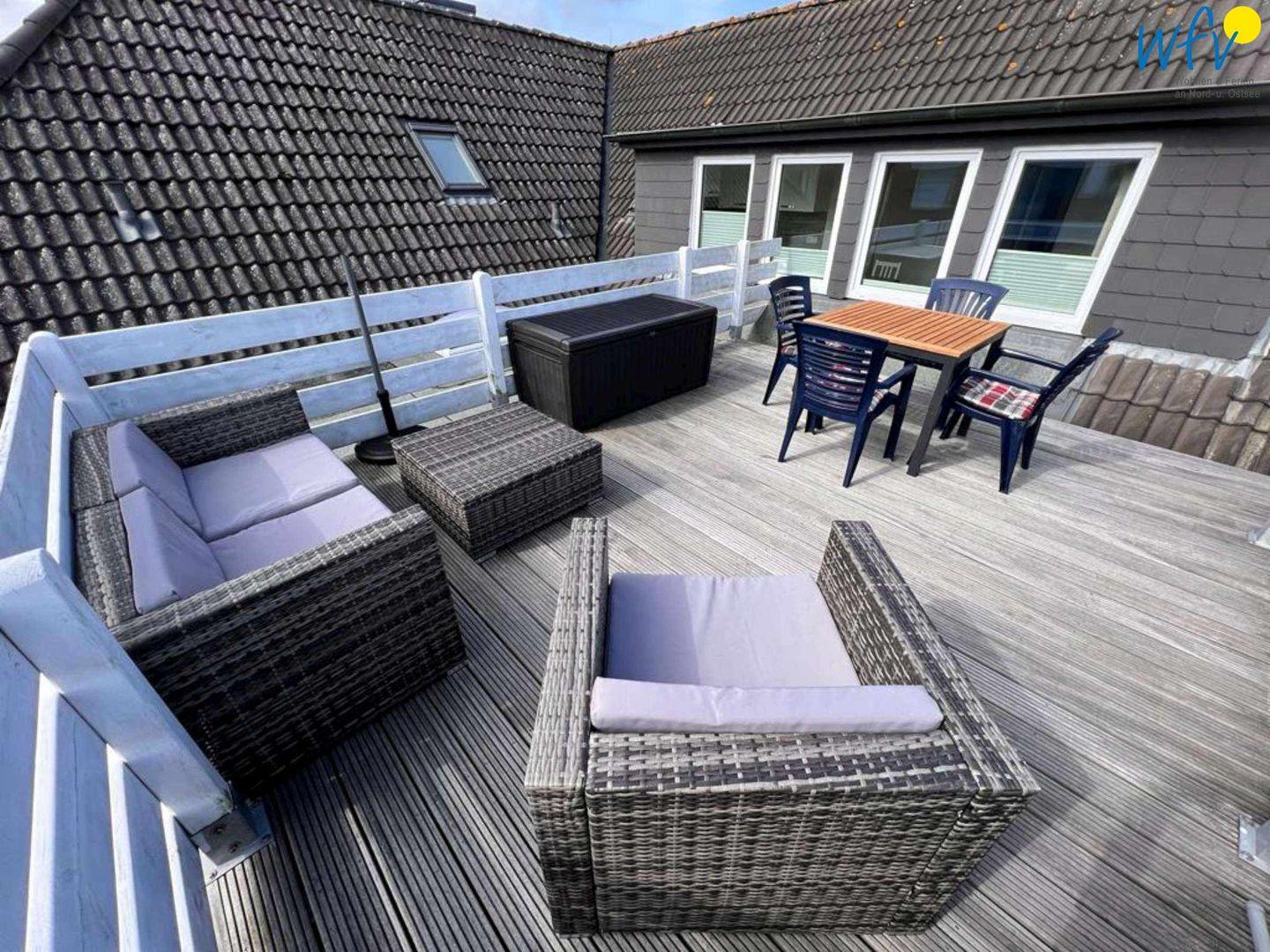 Das Frühstück können Sie bei gutem Wetter auch auf der Dachterrasse genießen! Vom Wohnzimmer aus gelangen Sie über einen kleinen Gang zur wohnungseigenen 20 m² großen Süd-Ost-Dachterrasse, auf der Sie ausgiebig mit Sonne verwöhnt werden. Bequeme Lounge-Möbel mit Beistelltisch sowie eine Essgruppe mit vier Stühlen und eine Kippliege sorgen für absolutes Urlaubsflair!