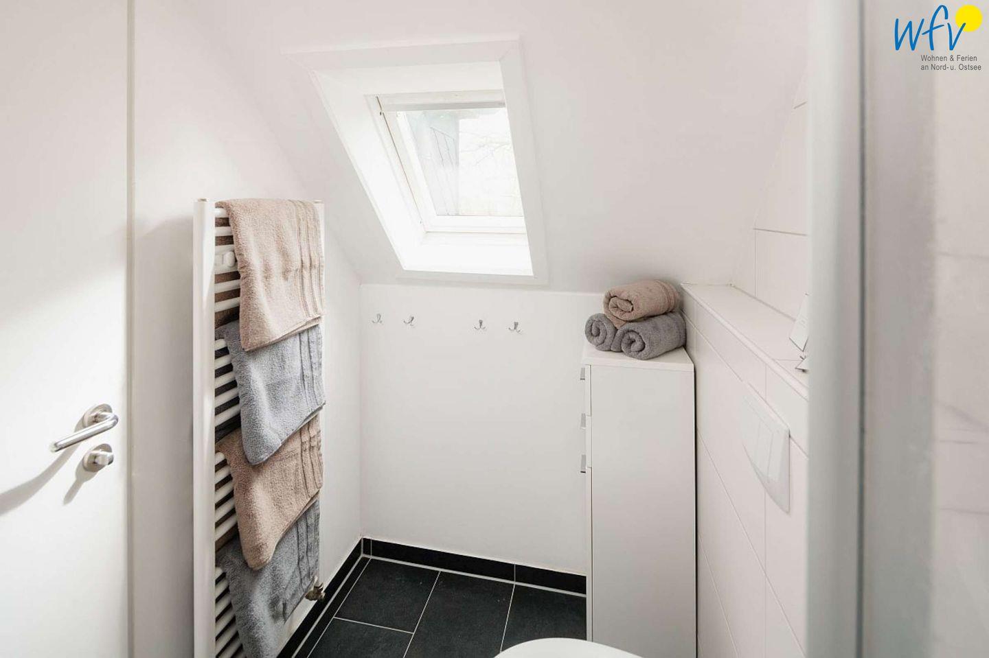 Das gepflegte Tageslichtbad mit Dusche (niedriger Einstieg), Handtuchheizung, Waschbecken und WC ergänzt den Wohnkomfort.