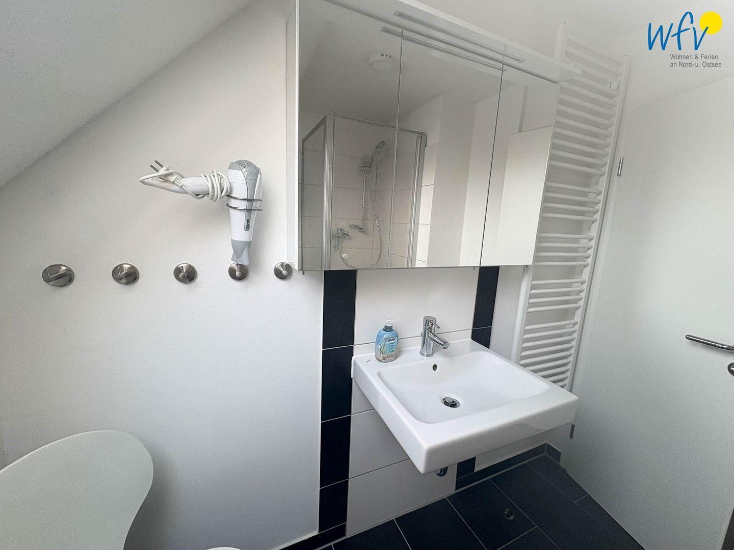 Das gepflegte Tageslichtbad verfügt über eine Dusche mit flachem Einstieg, eine Handtuchheizung, ein Waschbecken und ein WC.