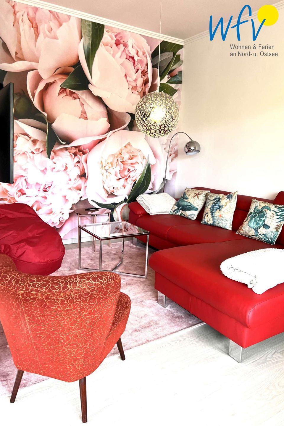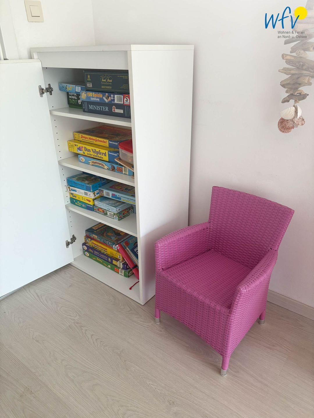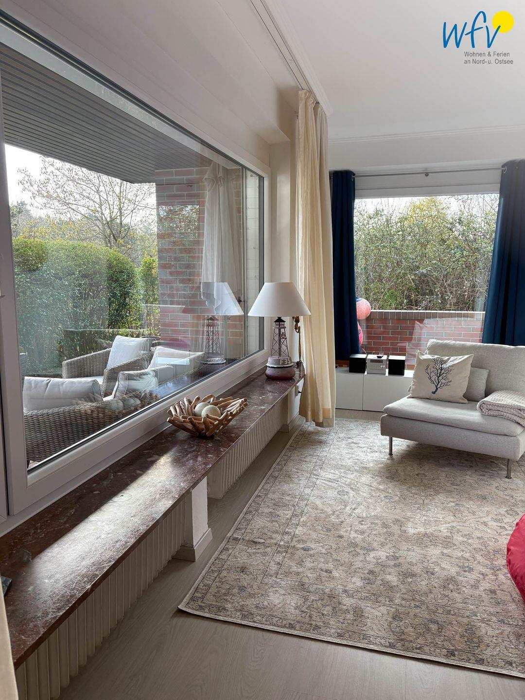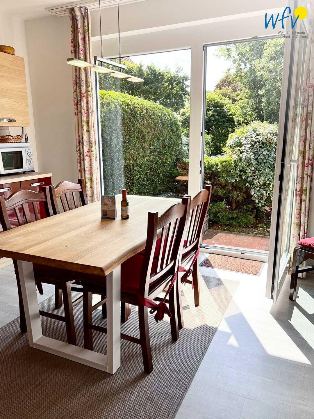 Eine stilvolle Einrichtung in harmonischen Farbtönen verleiht der Wohnung eine Atmosphäre, in der Sie sich auf Anhieb wohlfühlen werden. Herrlich relaxen können Sie besonders in dem gemütlichen Wohnraum mit Couch, TV und CD-Player sowie separater Leseecke mit einigen Büchern. Auch gemeinsame Spielenachmittage können veranstaltet werden; bedienen Sie sich gerne an unserem Schrank voller Gesellschaftsspiele. Ebenso sind Bücher für Erwachsene und Kinder vorhanden. Die breite Fensterfront mit direktem Blick auf die angrenzende Süd-West-Terrasse durchflutet den Wohnraum großzügig mit Sonne und Tageslicht.