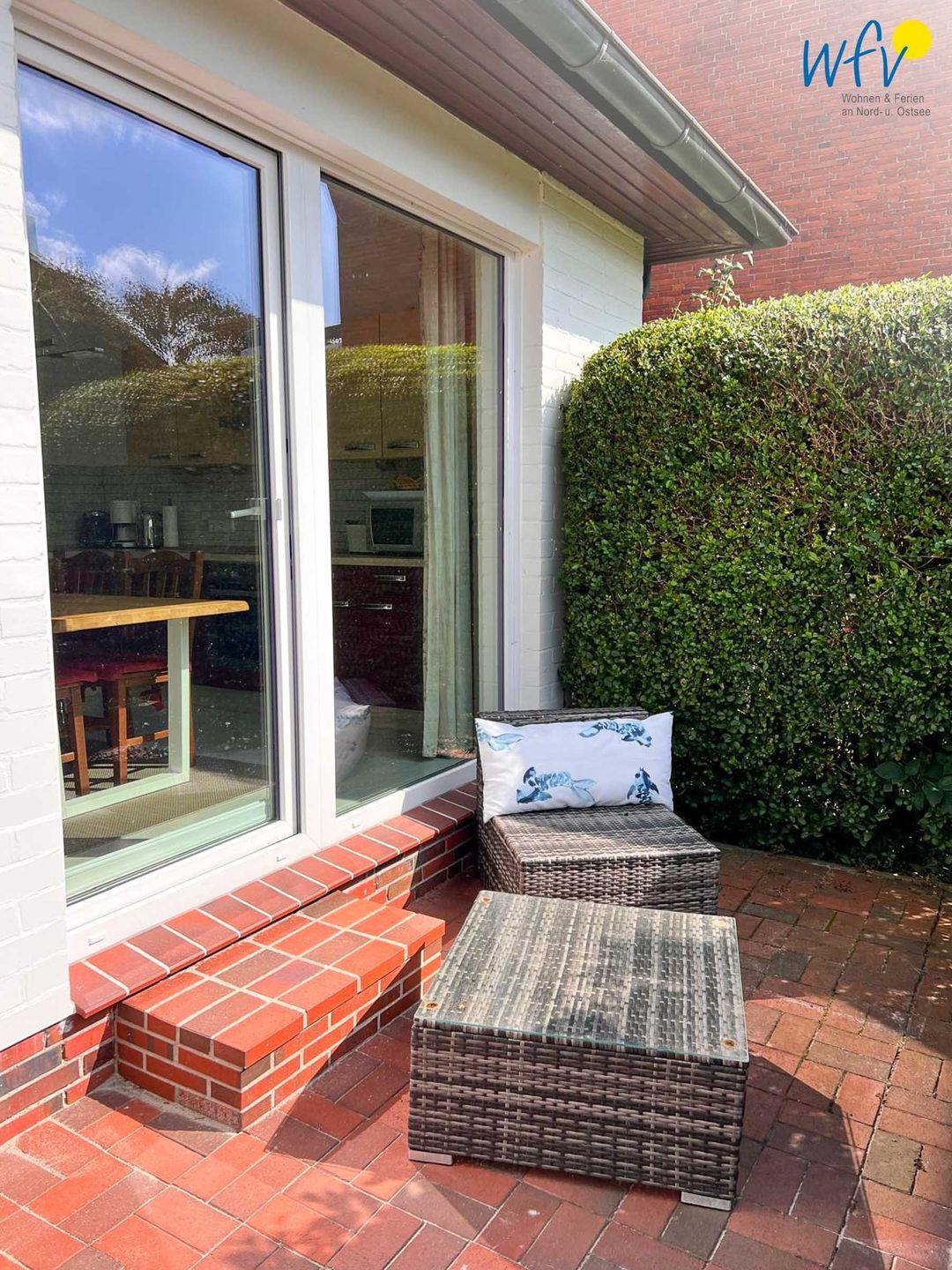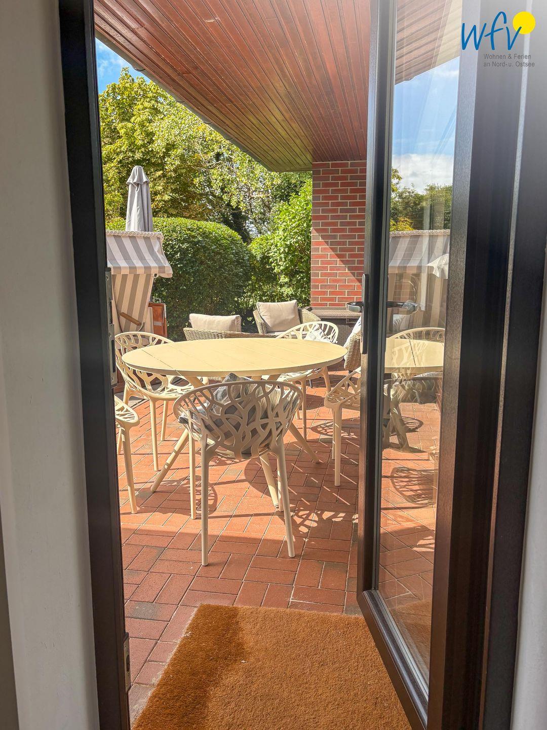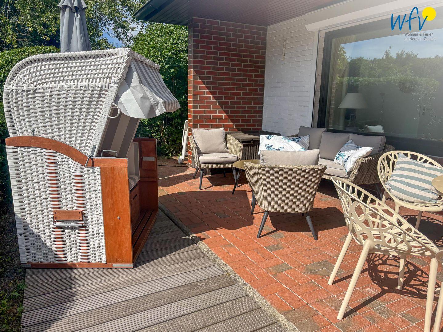 Von der Küche aus gelangen Sie auf die 48 m² große Süd-West-Terrasse. Hier wartet auf Sie ein Strandkorb und eine Sonnenliege, außerdem eine Essgruppe mit großem Tisch und fünf Stühlen sowie ein Lounge-Set bestehend aus einem 2-er Sofa, zwei Sesseln und einem Tisch. Das ist pures Urlaubsflair! Die Terrasse liegt geschützt am Haus und ist zur Hälfte überdacht, sodass Sie auch bei einem sommerlichen Regenschauer wohltuende Nordseeluft genießen können. Auf der Küchenterrasse befindet sich ebenfalls ein kleines Lounge-Set zum Relaxen.