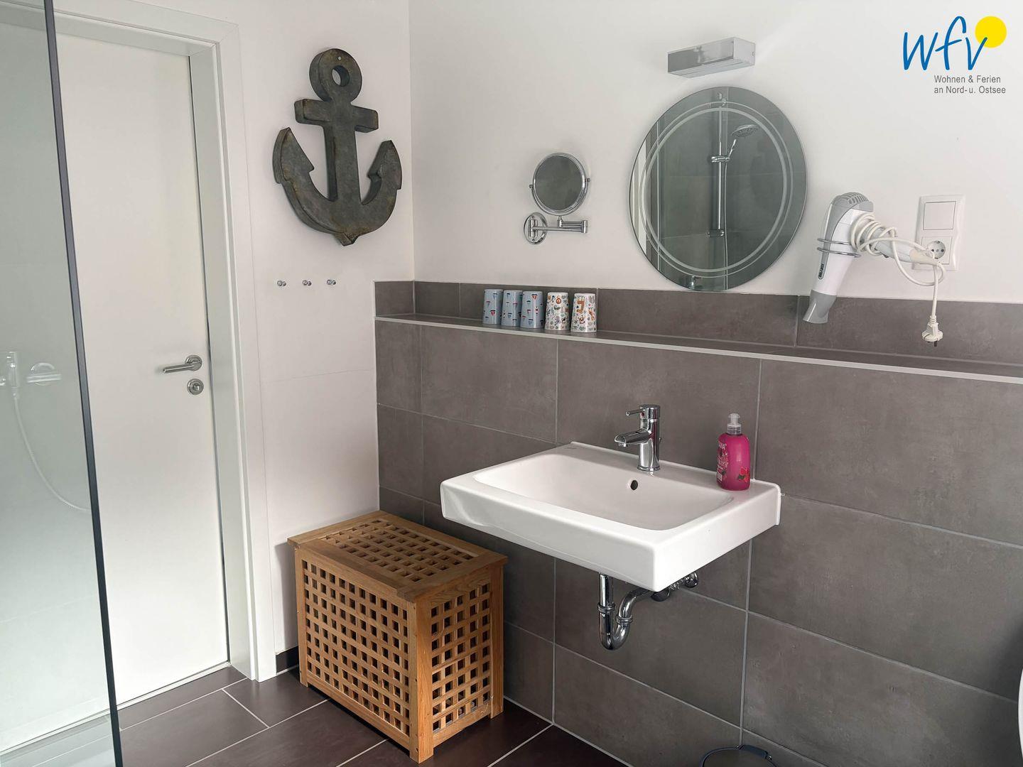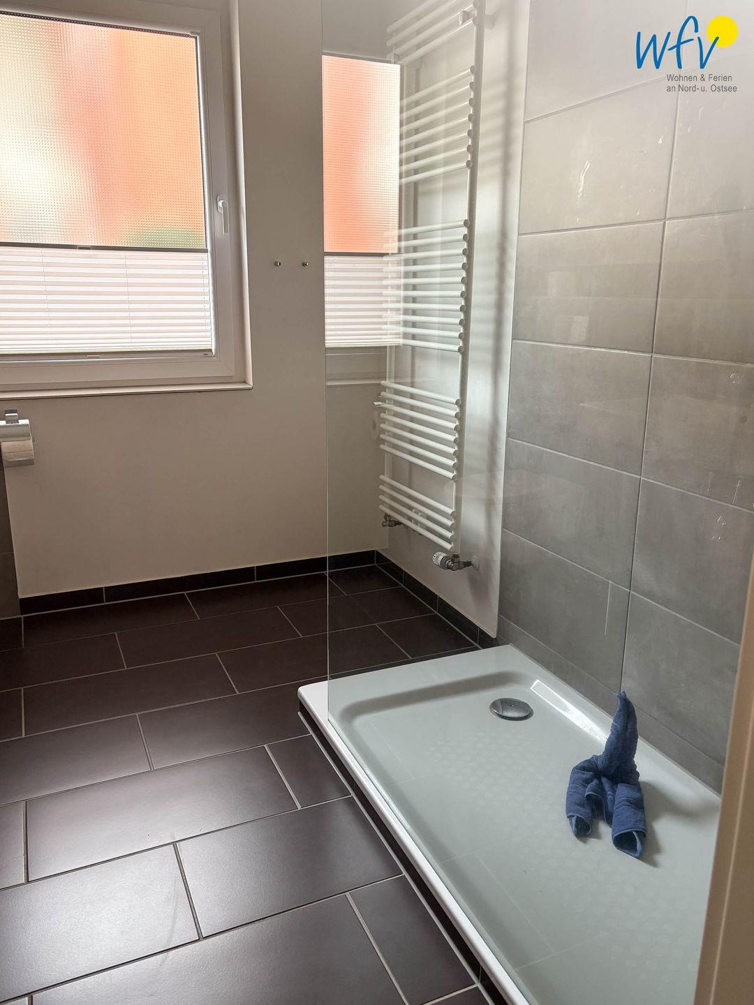 Das gepflegte Tageslichtbad verfügt über eine große bodengleiche Dusche, eine Handtuchheizung, ein Waschbecken und ein WC.