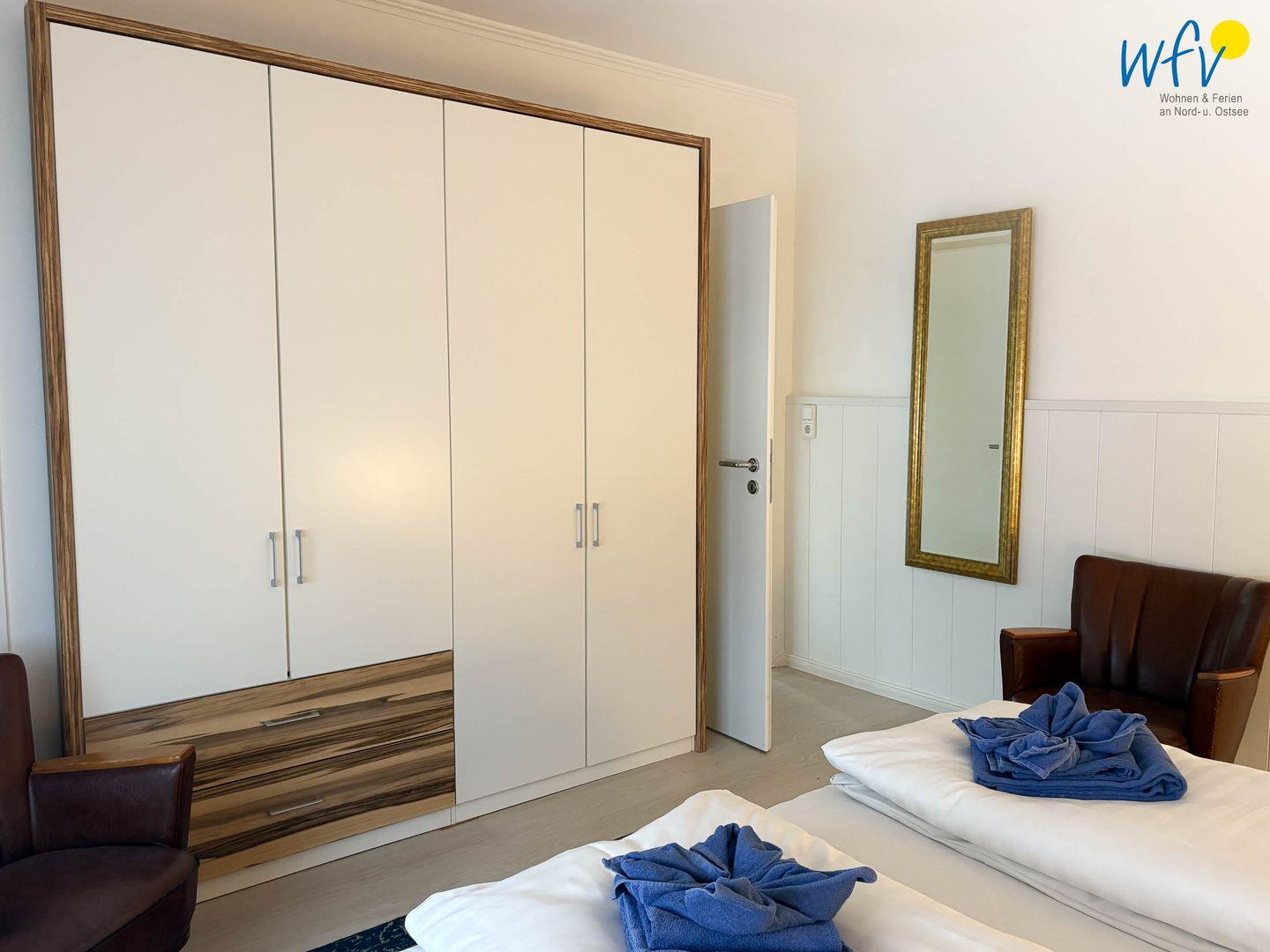 Durch drei separate Schlafzimmer bestehen in der Ferienwohnung optimale Aufteilungsmöglichkeiten. Zwei der Zimmer sind mit einem Doppelbett (2 x 90 cm x 200 cm) ausgestattet, eines mit einem Einzelbett (90 cm x 200 cm). Die Zimmer mit Doppelbett lassen sich mit einer elektrischen Jalousie angenehm verdunkeln. In einem der Räume befinden sich zwei bequeme Ledersessel, die Ihnen Gelegenheiten zum Lesen oder zum gemütlichen Ausspannen bieten. Der große zweite Flur ist zusätzlich mit einem Sofa und einem gefüllten Spieleschrank ausgestattet und kann als Ruhe- und Leseraum genutzt werden.