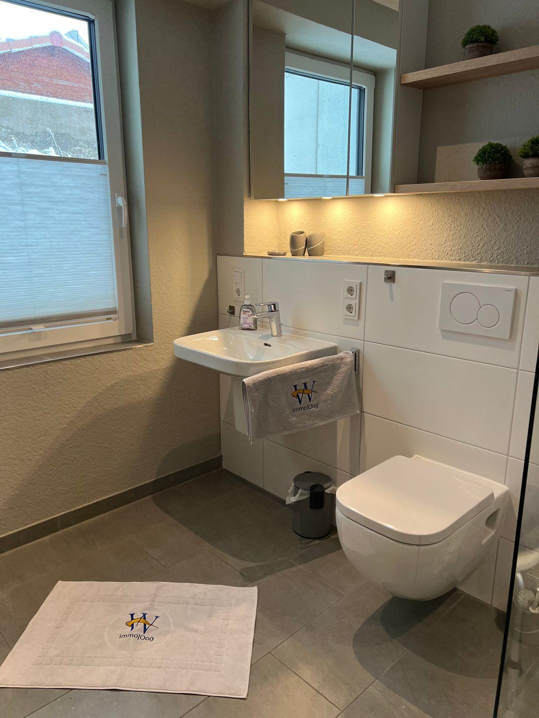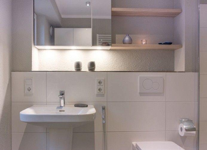 Das moderne behindertenfreundliche Bad ist mit sehr ansprechenden Einbaumöbeln ausgestattet und verfügt über eine Dusche und einen Haartrockner.