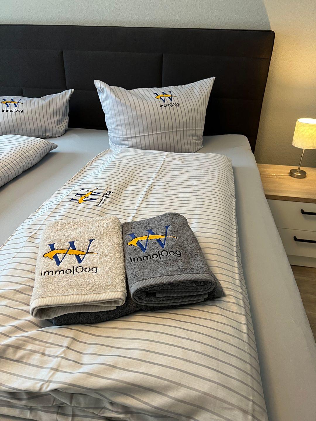 Das hochwertig eingerichtete Schlafzimmer ist mit einem großen Boxspringbett (2,00m x 2,00m) ausgestattet. Die Schlafzimmerschränke bieten ausreichend Stauraum.