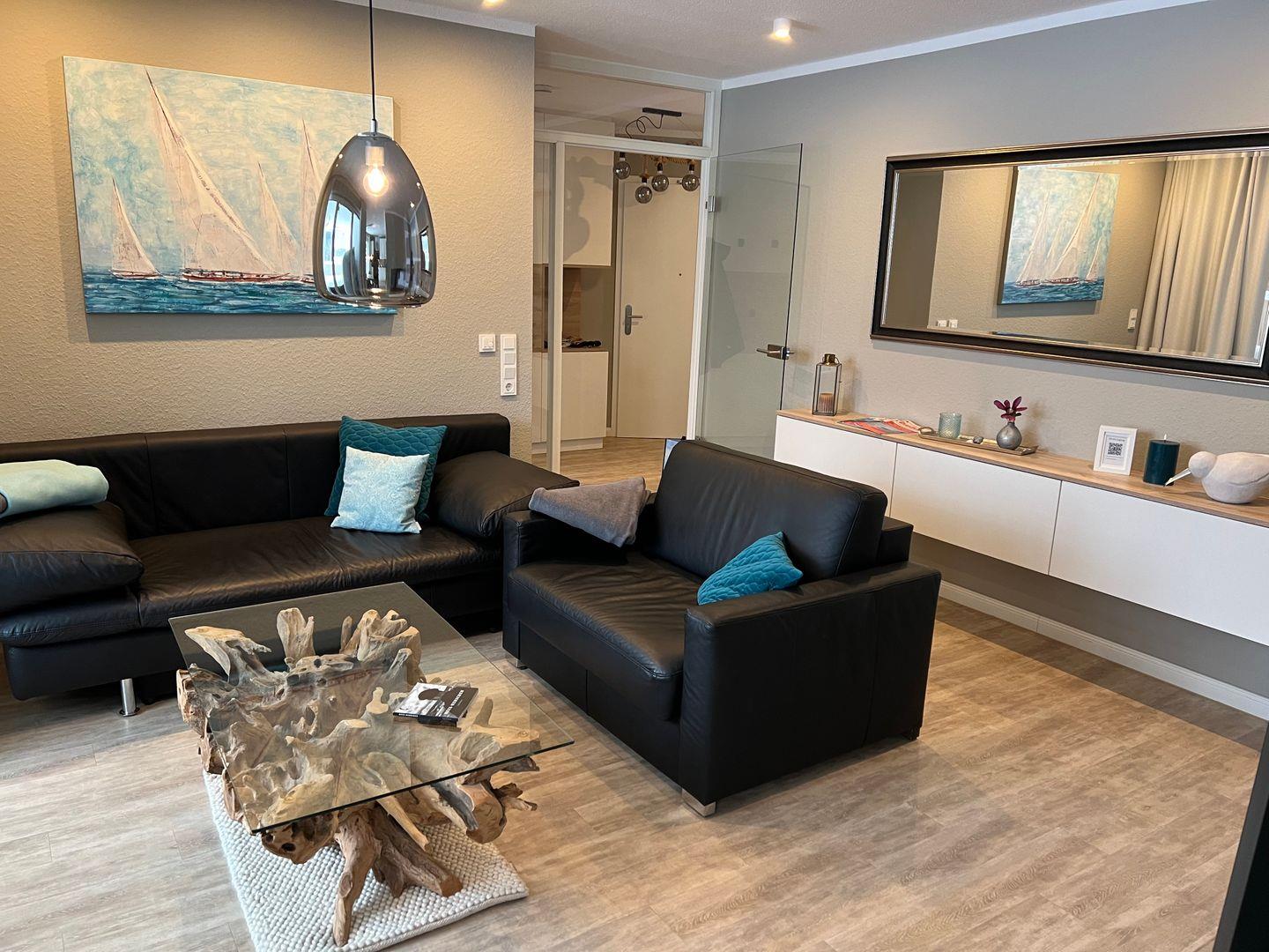 Ein besonderes Wohlfühlambiente bietet der helle Wohnbereich mit einer stilvollen Einrichtung, einem hochwertigen Ledersofa und zwei Ledersesseln. Vom Bodenbelag bis zu den Accessoires ist alles farblich aufeinander abgestimmt. Hier fühlen Sie sich wie zu Hause.