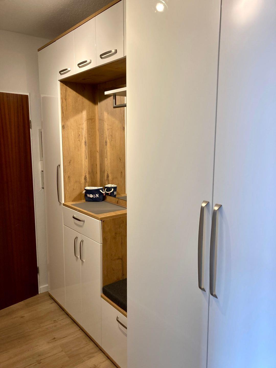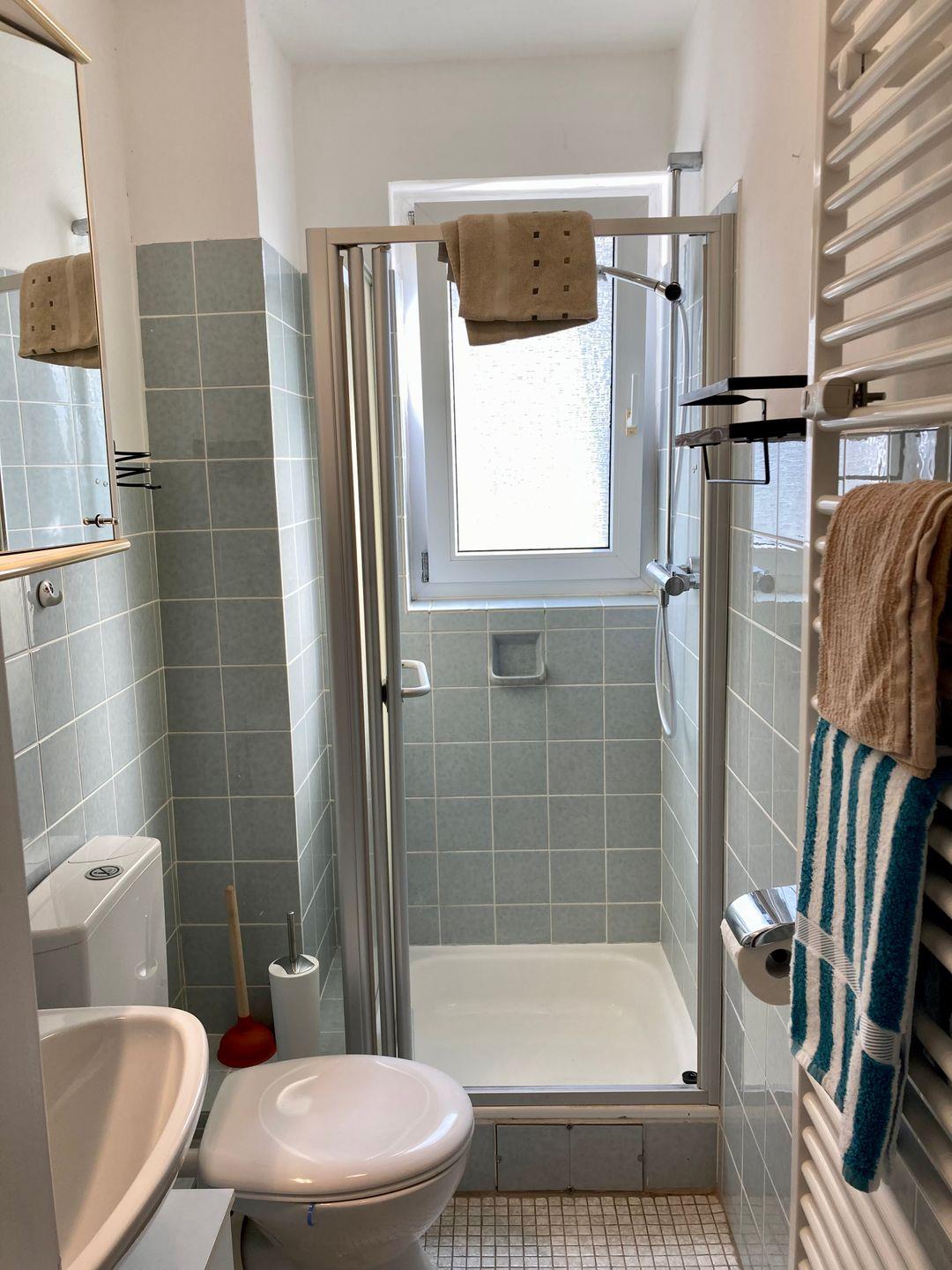 Im Flur der Unterkunft gibt es genug Stauraum u Kleiderschrank. Von dort aus gelangt man zum kleinen Duschbad, welches ein kl. Fenster zum Lüften hat.