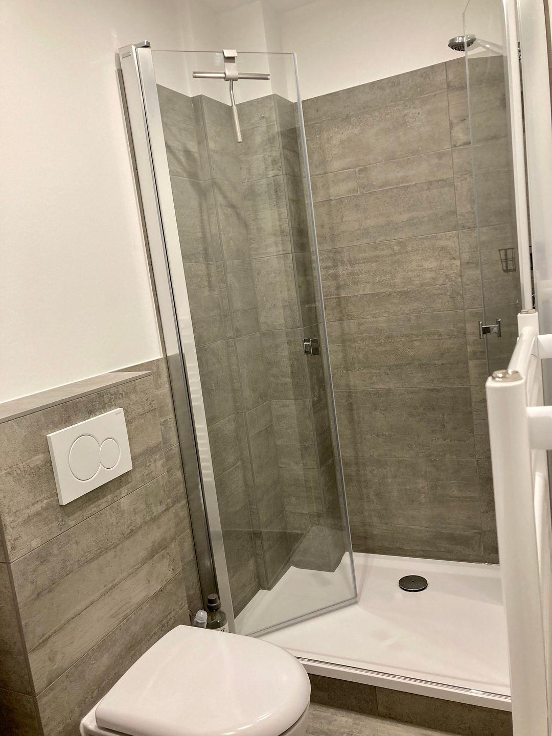 Das ebenfalls neu renovierte Badezimmer ist hell u freundlich gefliest und verfügt zudem über eine Dusche