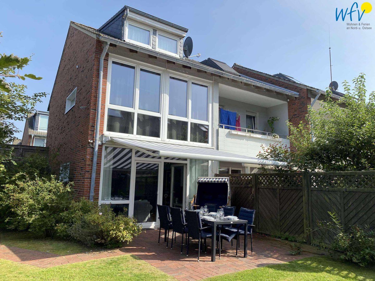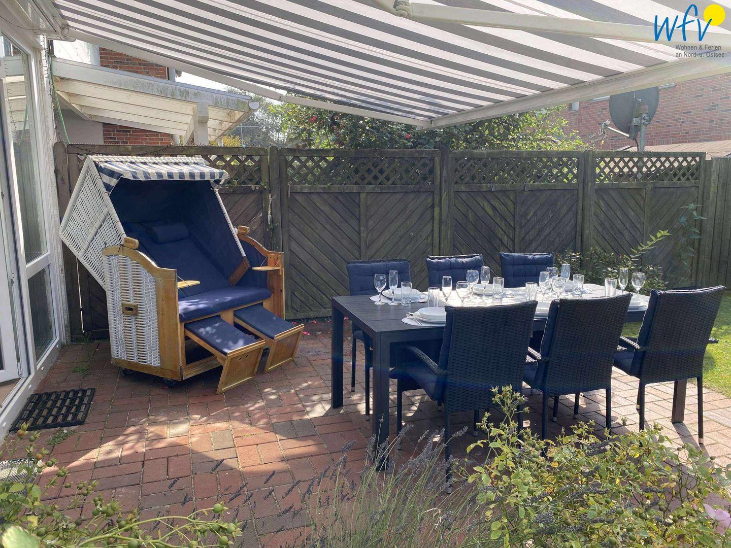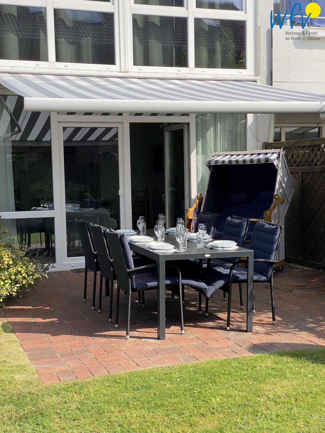 Auch nach dem Strandtag kommen Sie weiterhin in den Genuss von Sonne und Nordseeluft: zu dem Ferienhaus gehört eine Terrasse mit bequemen Gartenmöbeln, Markise und Strandkorb. Wunderbar, um in Ruhe eine gutes Buch zu lesen, zu grillen oder den Tag bei einem Glas Wein ausklingen zu lassen. (Bei Regen bitte die Markise einfahren). An die Terrasse grenzt ein schöner begrünter Gartenanteil, in dem Ihre Kinder gerne spielen dürfen.