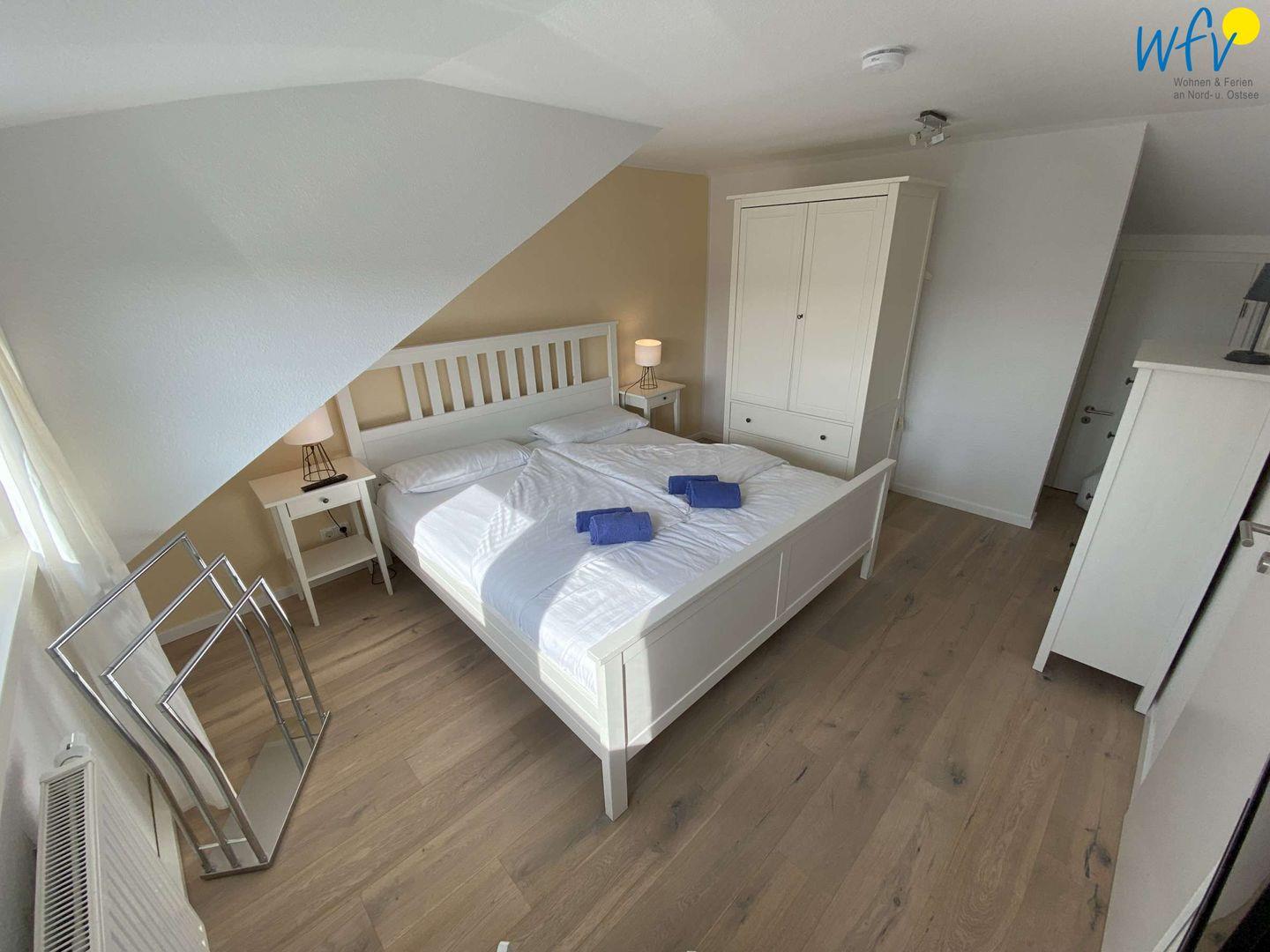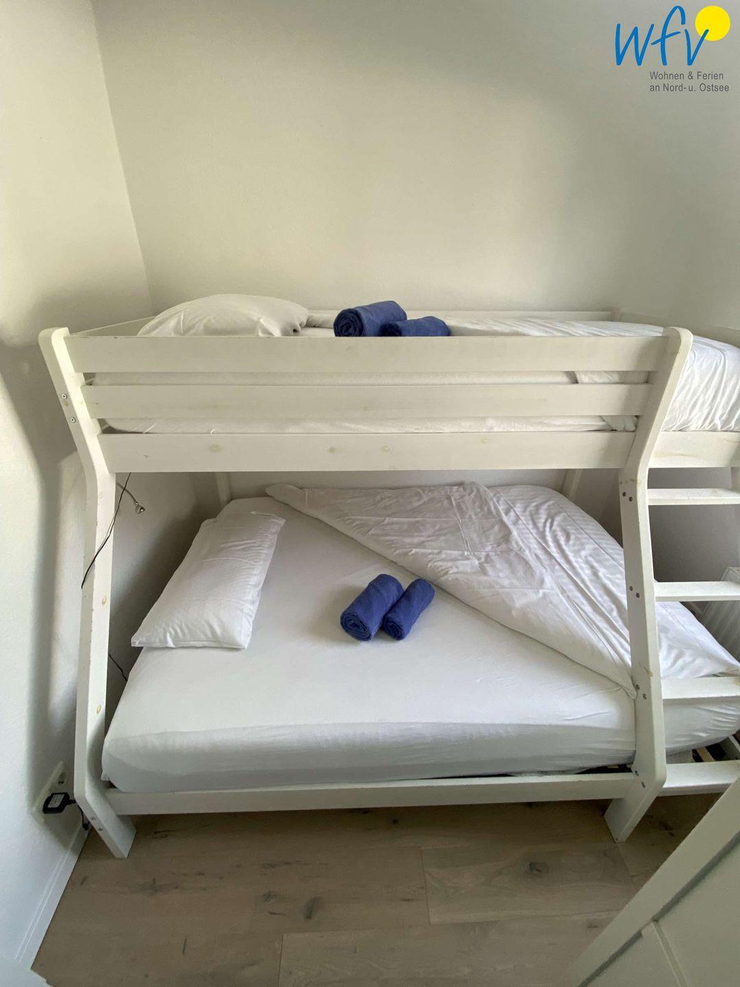 Wenn auf Wangerooge die Sonne untergeht, warten vier separate Schlafzimmer auf Sie! In zwei der Zimmer befindet sich jeweils ein Einzelbett (80 x 200), in einem ein Etagenbett (oben 90 x 200, unten 140 x 200) und in dem oberen vierten Schlafzimmer ein Doppelbett (180 x 200). Alle Betten sind mit TEMPUR Matratzen ausgestattet; Kleiderschränke bieten Platz für Ihre Urlaubsgarderobe. Drei der Schlafzimmer verfügen über jeweils ein LED TV (2 x mit DVD), sodass vom Bett aus Filme geschaut werden können. In den Kinderzimmern (rot + grün) befindet sich neben dem TV jeweils ein CD-Player. Einige CDs und DVDs sind vorhanden.
