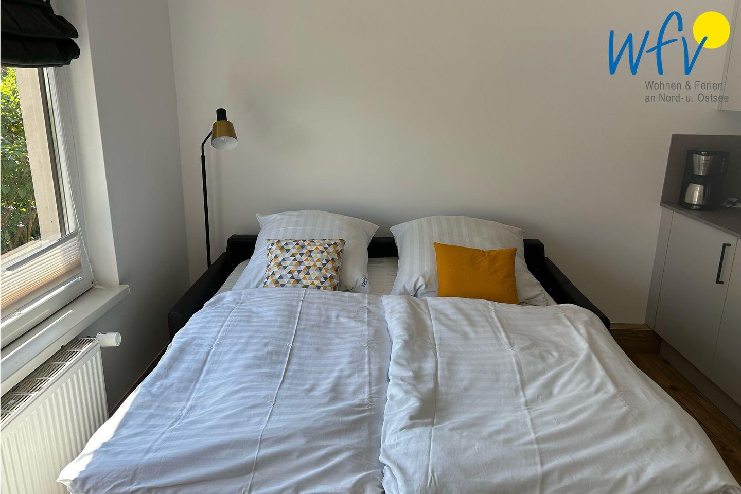 Wenn auf Wangerooge die Sonne untergeht, wartet im separaten Schlafzimmer ein komfortables Boxspringbett auf Sie (160 x 200 cm). Ein geräumiger Kleiderschrank bietet Platz für die Urlaubsgarderobe. Für zwei weitere Personen lässt sich das Sofa im Wohnraum im Handumdrehen in eine bequeme Schlafcouch verwandeln. Nach Rückmeldung unserer Gäste empfehlen wir, bei Nutzung der Wohnung mit mehr als 2 Personen, das Schlafsofa aus Platzgründen während der Mahlzeiten wieder einzuklappen (siehe Bild mit Tisch und ausgeklapptem Sofa). Der Esstisch kann zudem mit einer Einsteckplatte vergrößert werden.