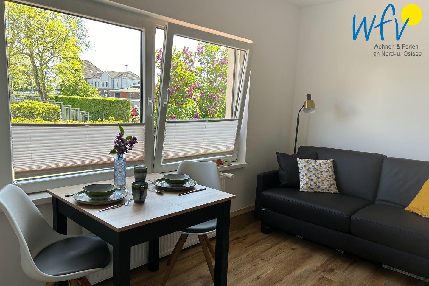 Dank der durchdachten Raumaufteilung in einen Wohnraum mit integrierter Küchenzeile (13 m²), ein separates Schlafzimmer (12 m²) und ein Duschbad (3 m²) ist die Wohnung perfekt für Paare oder kleine Familien. Frische Nordseeluft und Morgensonne tanken Sie auf der hübsch möblierten Terrasse.