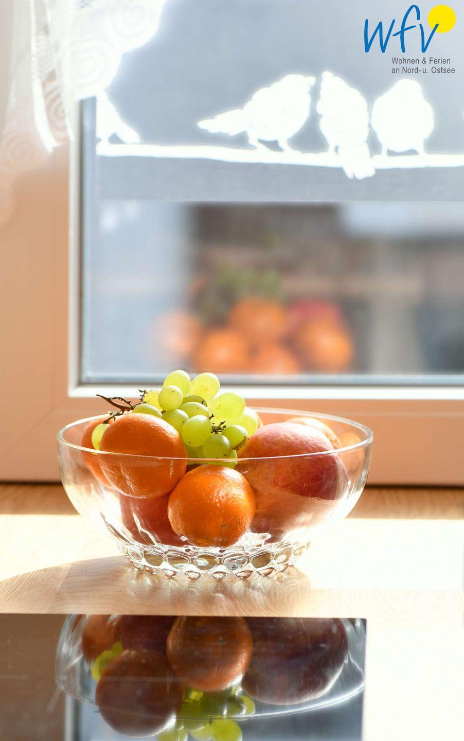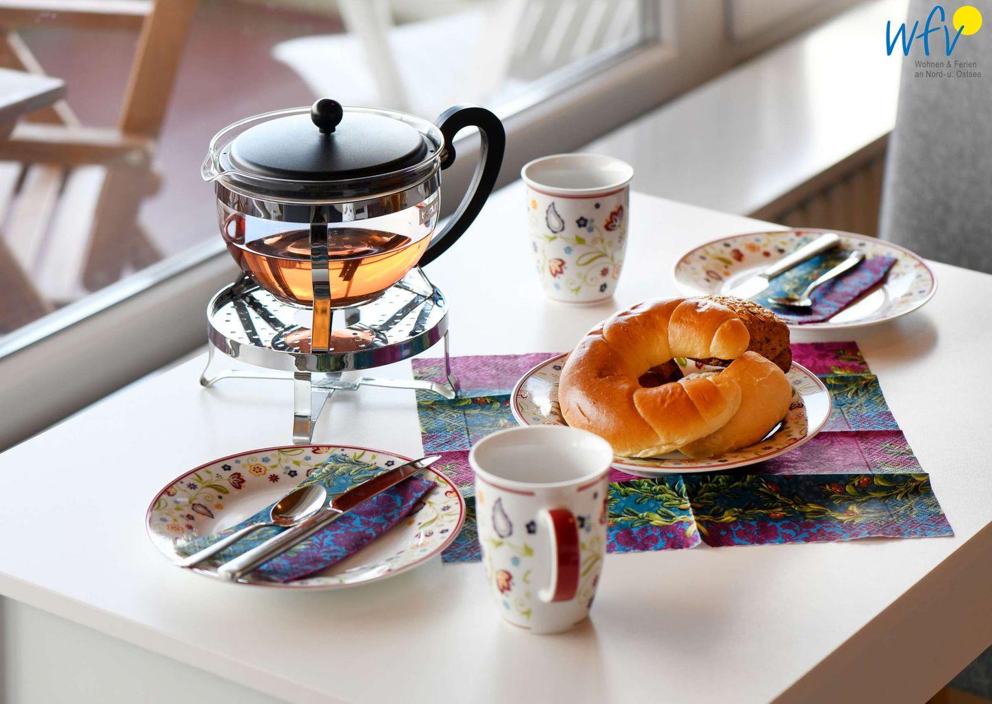 Bereits beim Ferienfrühstück starten Sie am Esstisch mit einem herrlichen Ausblick in den Urlaubstag. In Gedanken wird schon die Badetasche gepackt oder der Rucksack für den Strandspaziergang. Bei gutem Wetter können Sie natürlich auch auf dem Balkon frühstücken: Bequeme Gartenmöbel laden hier zum Verweilen und Ausspannen ein. Der Balkon ist überdacht und liegt in Richtung Westen, so kommen Sie in den Genuss lauschiger Abendstunden mit herrlichen Sonnenuntergängen.
