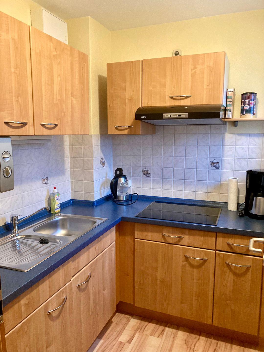 Der gemütliche Wohn-Essbereich lädt mit dem großen Sofa zum Verweilen an. Die angrenzende Küche bietet alles, was sie für eine bequeme Selbstverpflegung benötigen.