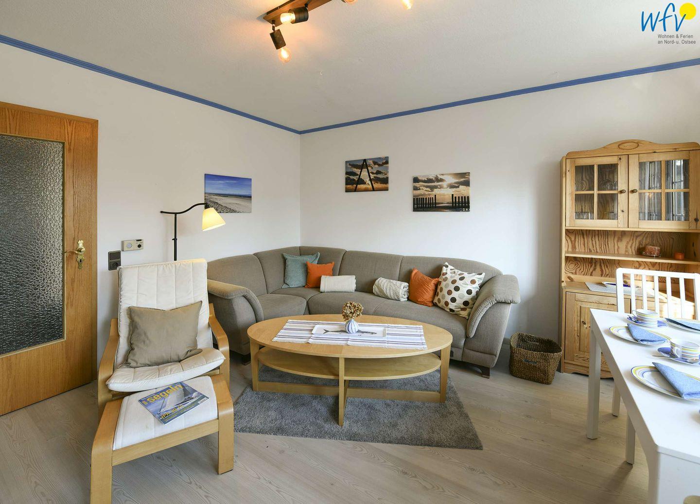Auf einer Wohnfläche von 65 m² über zwei Etagen (EG+OG) erwartet Sie eine optimale Raumaufteilung - mit großem Wohnraum, separater Küche, zwei separaten Schlafzimmern, Duschbad und Gäste-WC. Ein schöner Lichteinfall, ausgewähltes Mobiliar und liebevolle Accessoires verleihen der Wohnung eine freundliche Atmosphäre und das entsprechende Nordseegefühl.