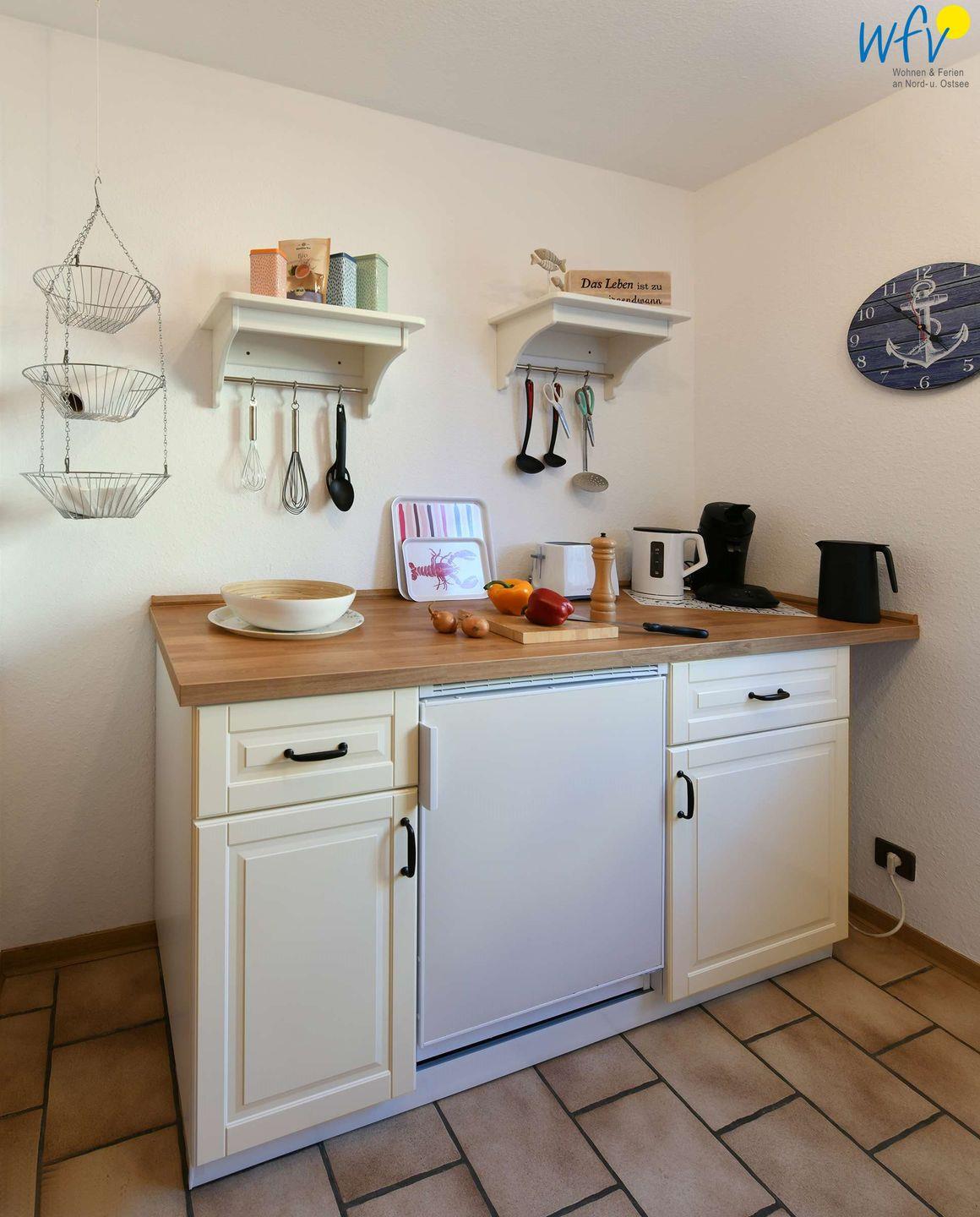 Damit Sie sich in Ihrem Urlaub auf Wangerooge bequem selbst verpflegen können, verfügt die Ferienwohnung "Kleiner Kompass" über eine Küche im hübschen Landhausstil. U.a. mit Herd (Ceranfeld), Backofen, Kühlschrank mit Gefrierfach, Geschirrspüler, Wasserkocher, Toaster, Mixer und Eierkocher. Zudem steht Ihnen ein SodaStream Wassersprudler zur Verfügung. Kaffeegourmets können zwischen einer klassischen Kaffeemaschine und einem Senseo-Vollautomaten (Kapseln) wählen.