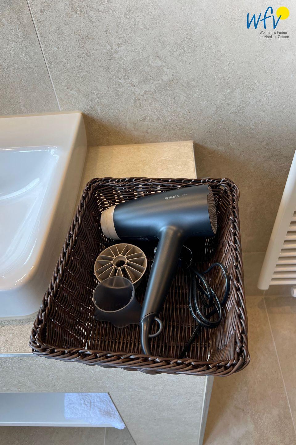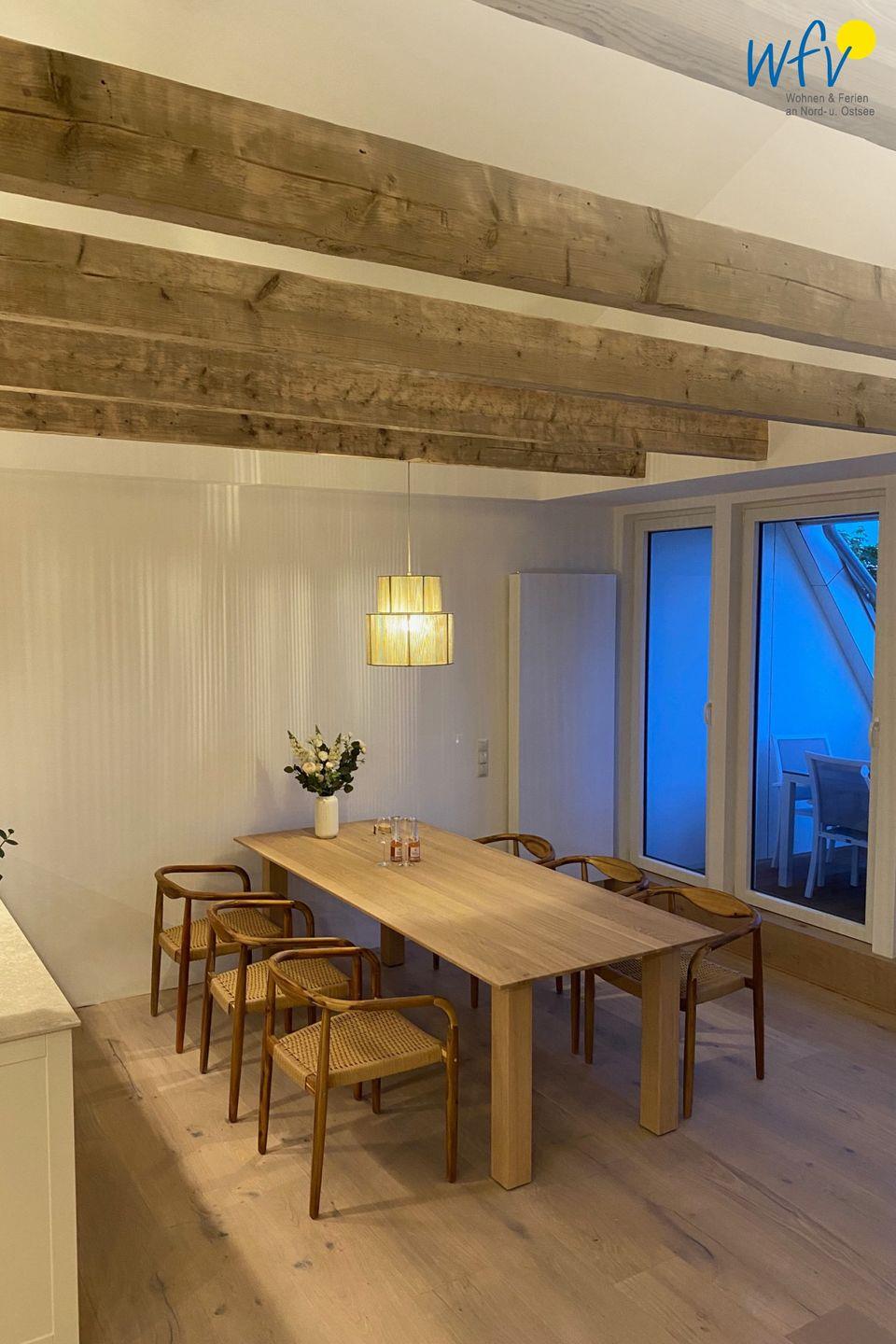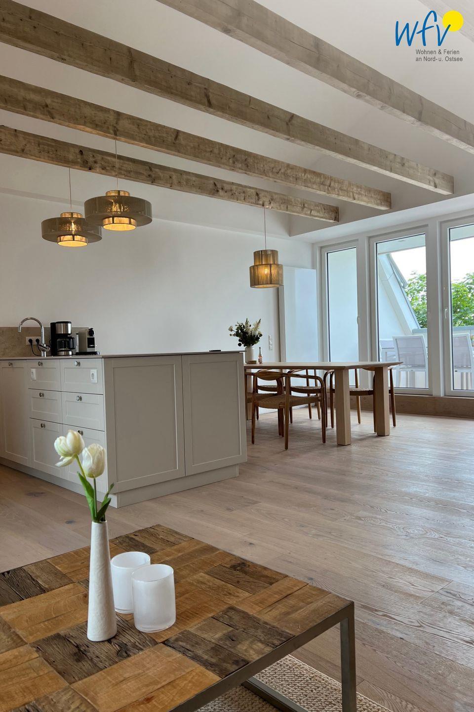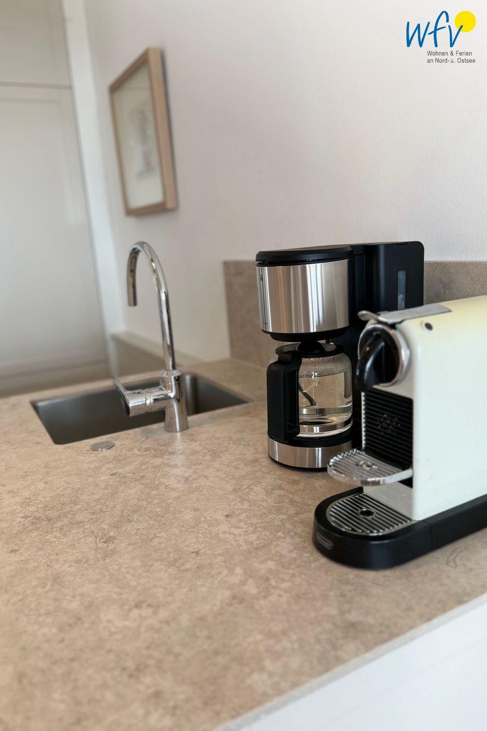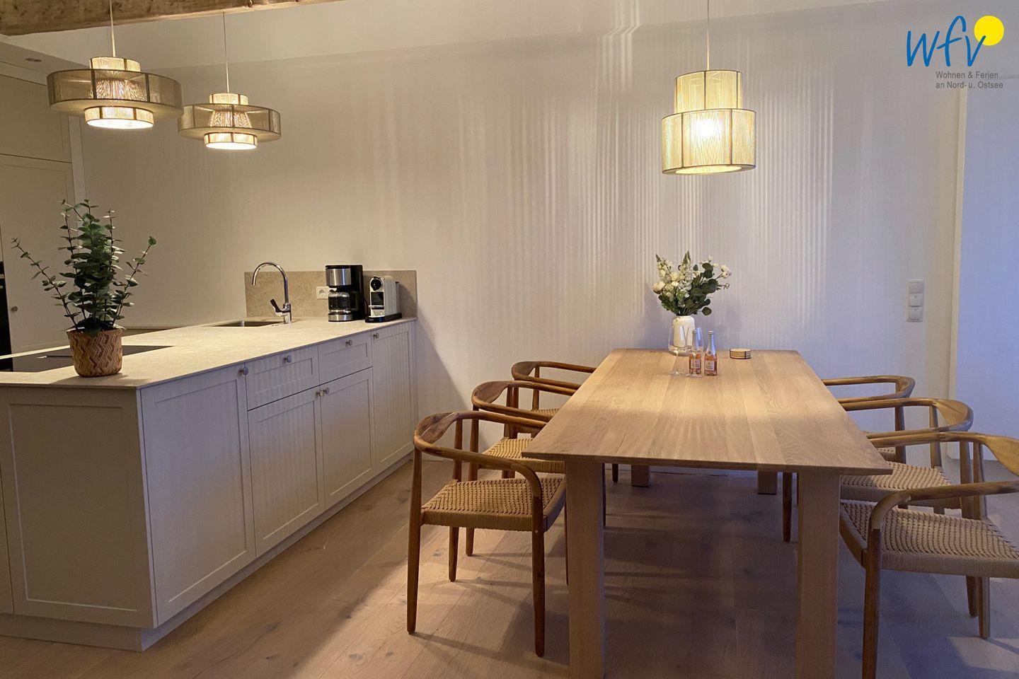 Am großen Esstisch mit schönem Blick nach draußen lassen sich beim entspannten Ferienfrühstück wunderbar Pläne für den Urlaubstag machen – für den Badetag am Strand oder die Fahrradtour über die Insel. Kaffeeliebhaber wählen in der modernen Küche zwischen der klassischen Kaffeemaschine und Nespresso. Und während anschließend der Rucksack für den Ausflug gepackt wird, erledigt die Spülmaschine den Abwasch für Sie.