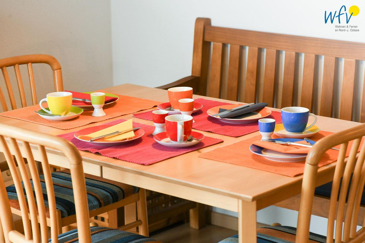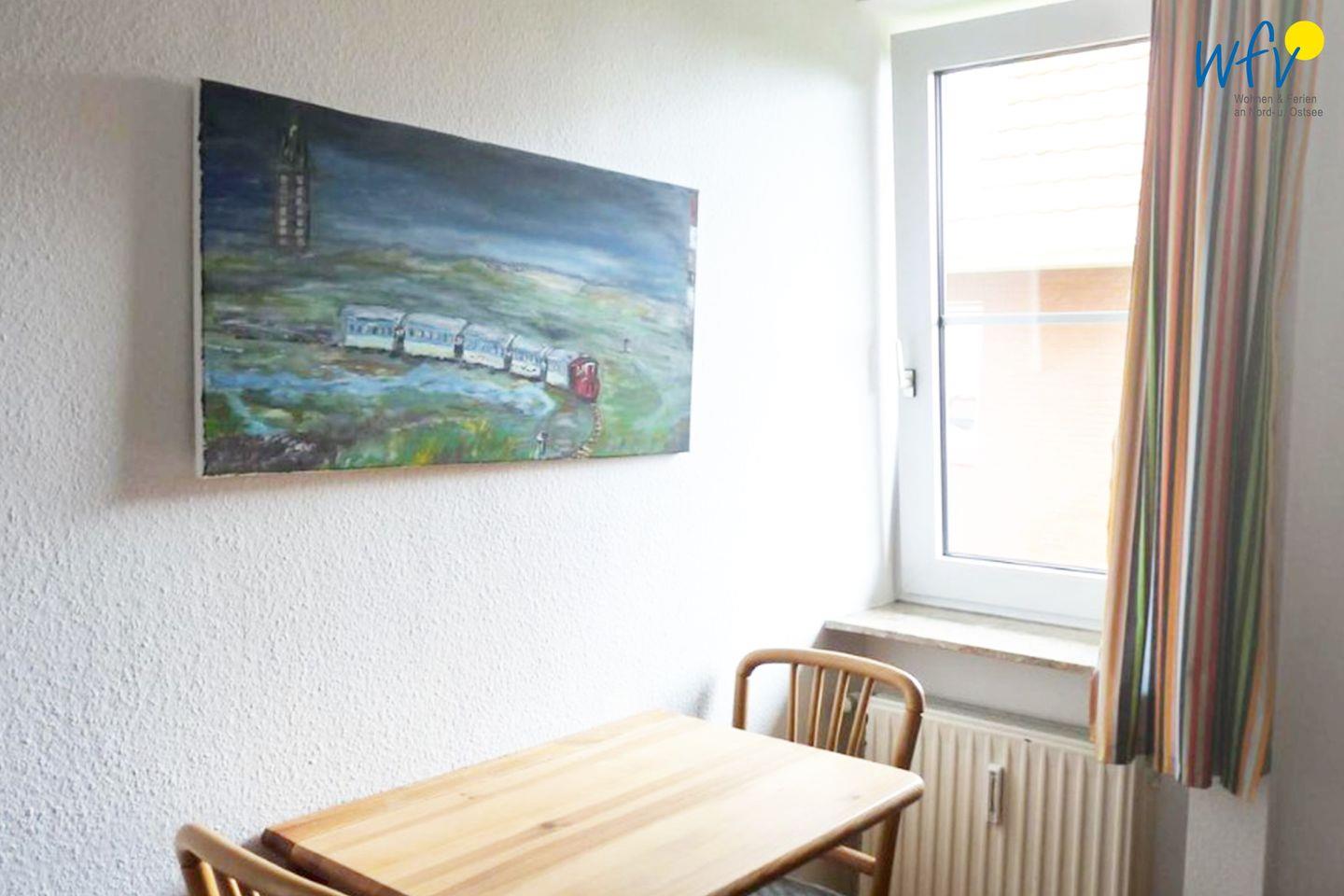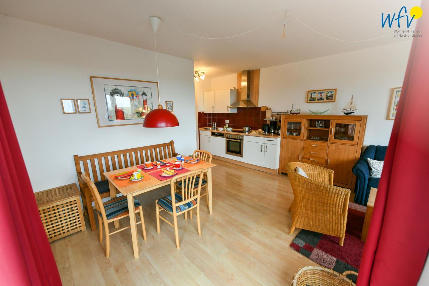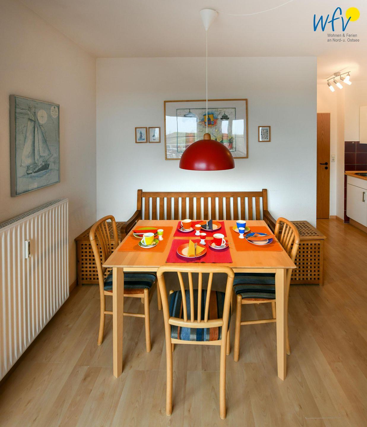 Der Esstisch mit weitem Blick auf den Deich lädt zum ausgiebigen Ferienfrühstück ein. Dieses lässt sich bequem in der integrierten Küche zubereiten. So können Sie ganz gemütlich den bevorstehenden Urlaubstag auf Wangerooge planen - mit Fahrradtour, Strandspaziergang oder Badetag. Während Sie anschließend den Rucksack packen, erledigt die Spülmaschine den Abwasch.