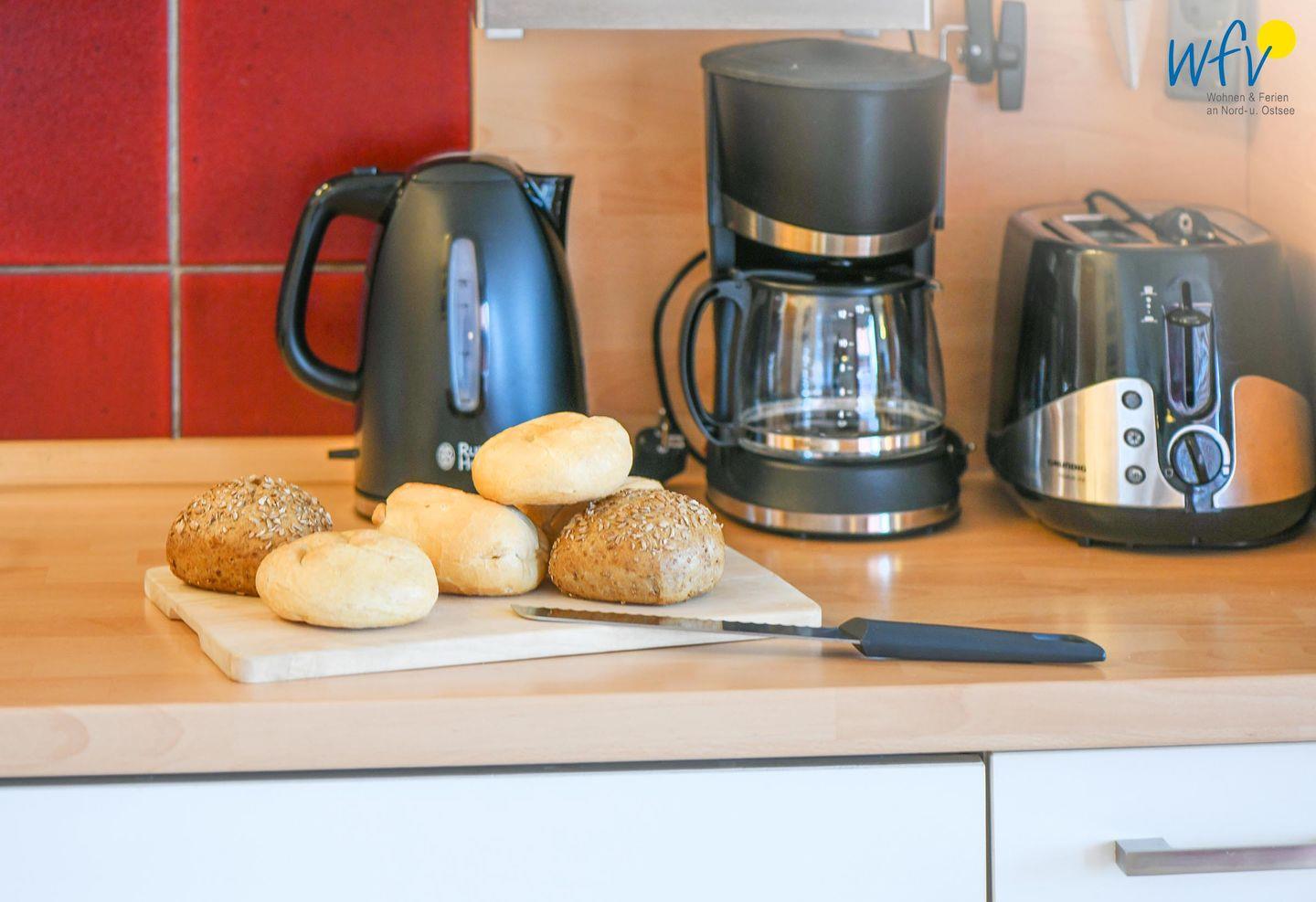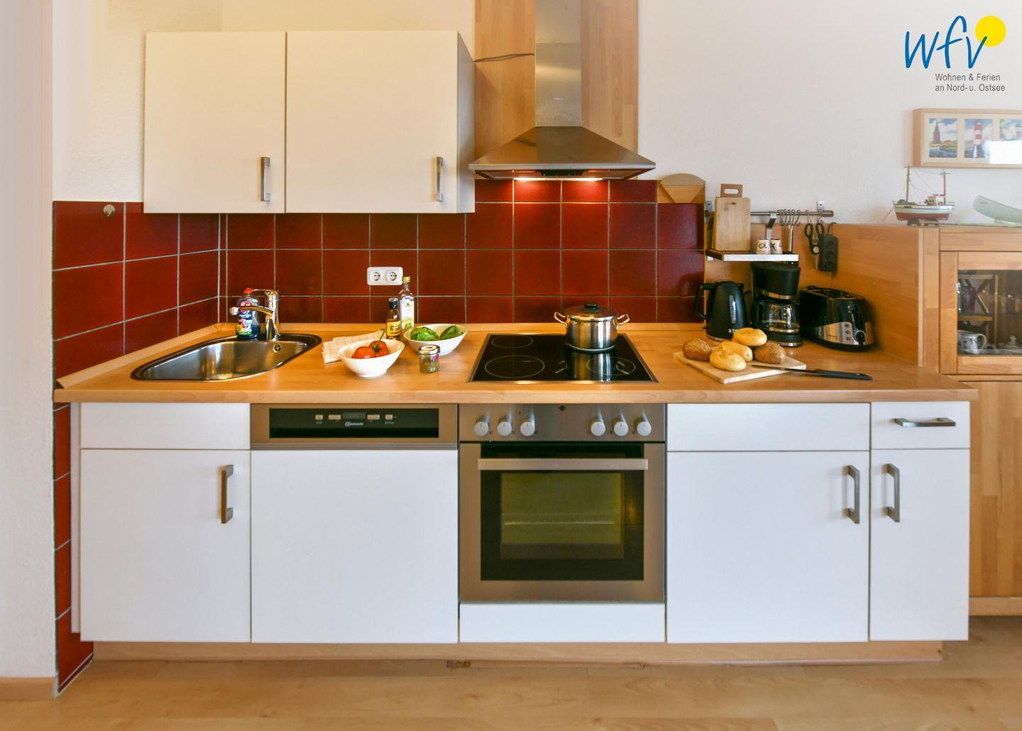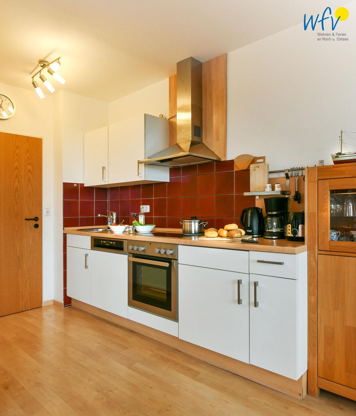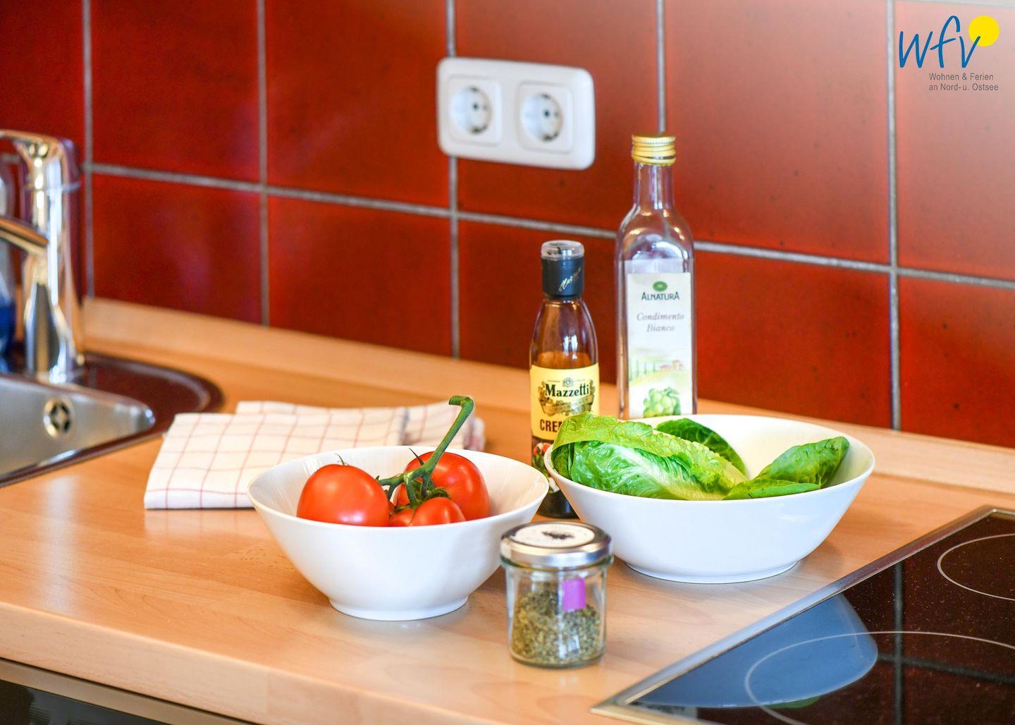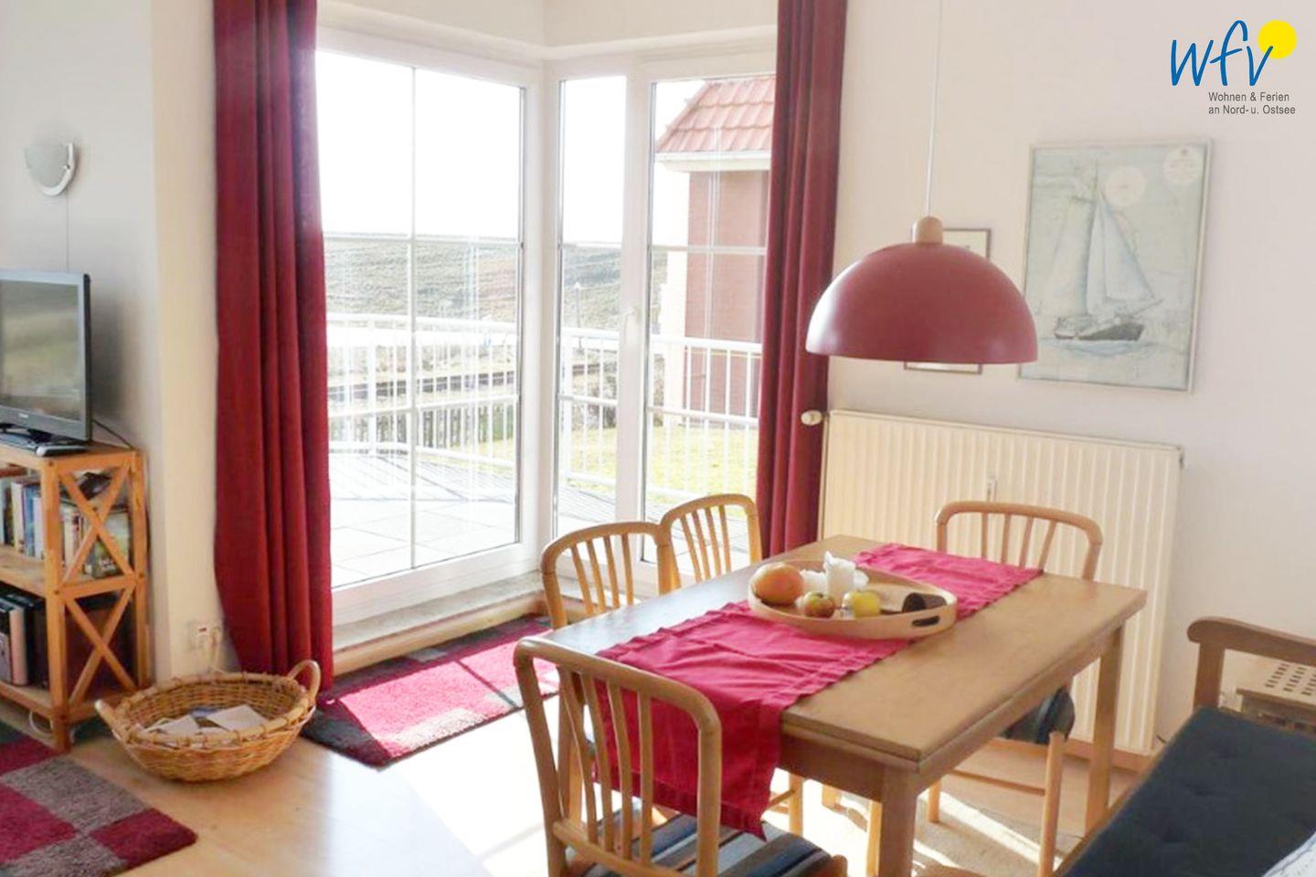 Der Esstisch mit weitem Blick auf den Deich lädt zum ausgiebigen Ferienfrühstück ein. Dieses lässt sich bequem in der integrierten Küche zubereiten. So können Sie ganz gemütlich den bevorstehenden Urlaubstag auf Wangerooge planen - mit Fahrradtour, Strandspaziergang oder Badetag. Während Sie anschließend den Rucksack packen, erledigt die Spülmaschine den Abwasch.